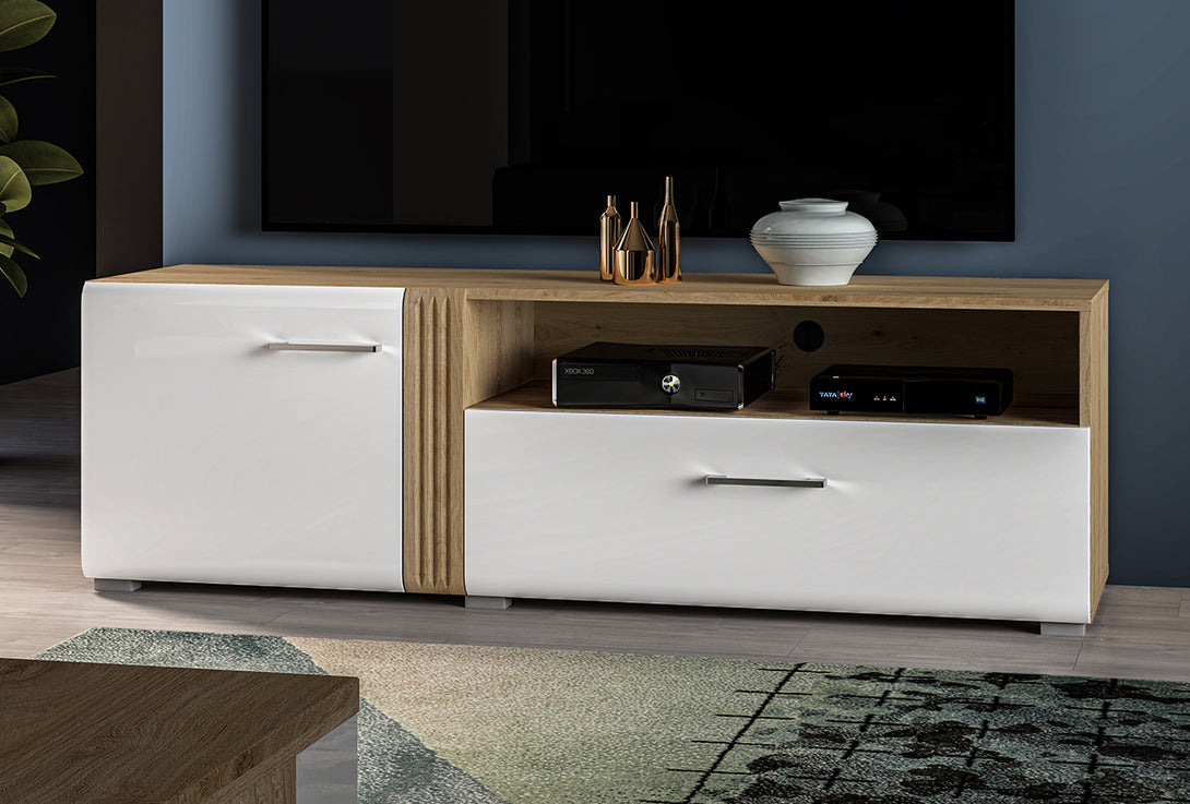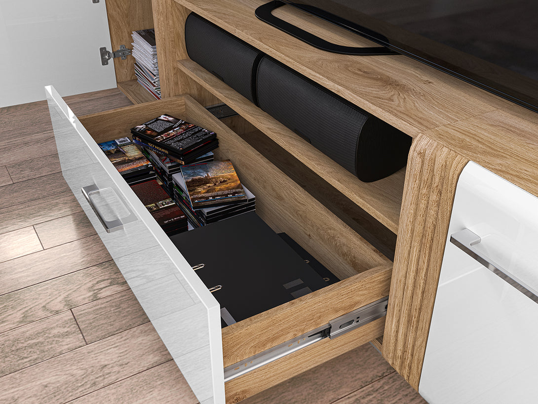 Der ADAGIO 07 TV-Schrank ist eine ideale Lösung für ein stilvolles und funktionales Wohnzimmer. Mit seinem modernen Design und der Kombination aus Dąb Castello Holzoptik und einer weißen Hochglanz-MDF-Front verleiht er dem Raum ein elegantes Ambiente. Die hochwertige Verarbeitung, der geräuschlose Schließmechanismus und die ABS-Kanten sorgen für Langlebigkeit und Komfort im täglichen Gebrauch. Die Schubladen mit Vollauszug bieten großzügigen Stauraum und eine erhöhte Tragfähigkeit für Ihre technischen Geräte und Zubehör.