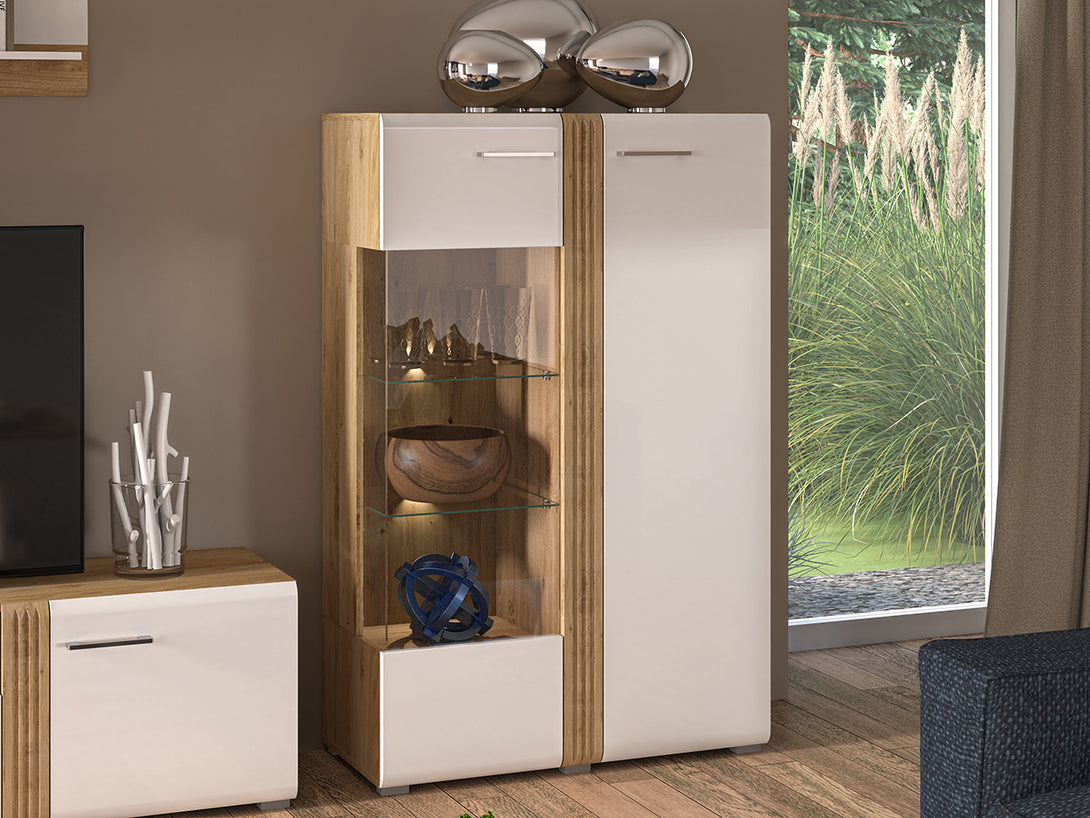 Das ADAGIO Wohnzimmerset umfasst sieben sorgfältig ausgewählte Möbelstücke: eine Vitrine, ein Vitrine, ein TV-Schrank, eine TV-Schrank-Erweiterung, ein Regal, einen Couchtisch und eine große Kommode. Alle Teile überzeugen durch ihre Kombination aus hochwertiger Laminat-Holzoptik und glänzender weißer MDF-Front, die jedem Wohnraum Eleganz und Funktionalität verleiht. Dieses Set bietet vielseitige Stauraumlösungen und moderne Designakzente für ein stilvolles Ambiente in Ihrem Zuhause.