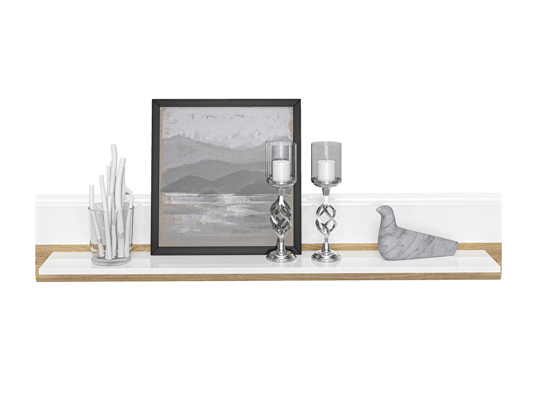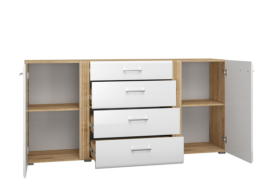 • Hochwertige Laminat-Holzoptik und weiße Hochglanz MDF-Front