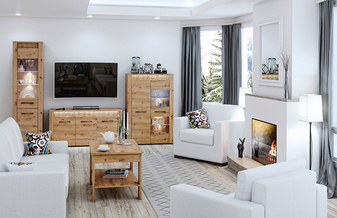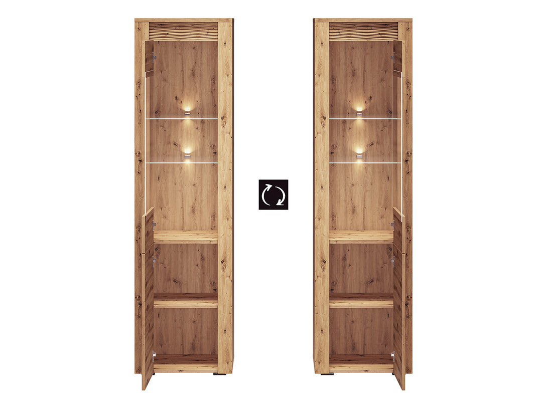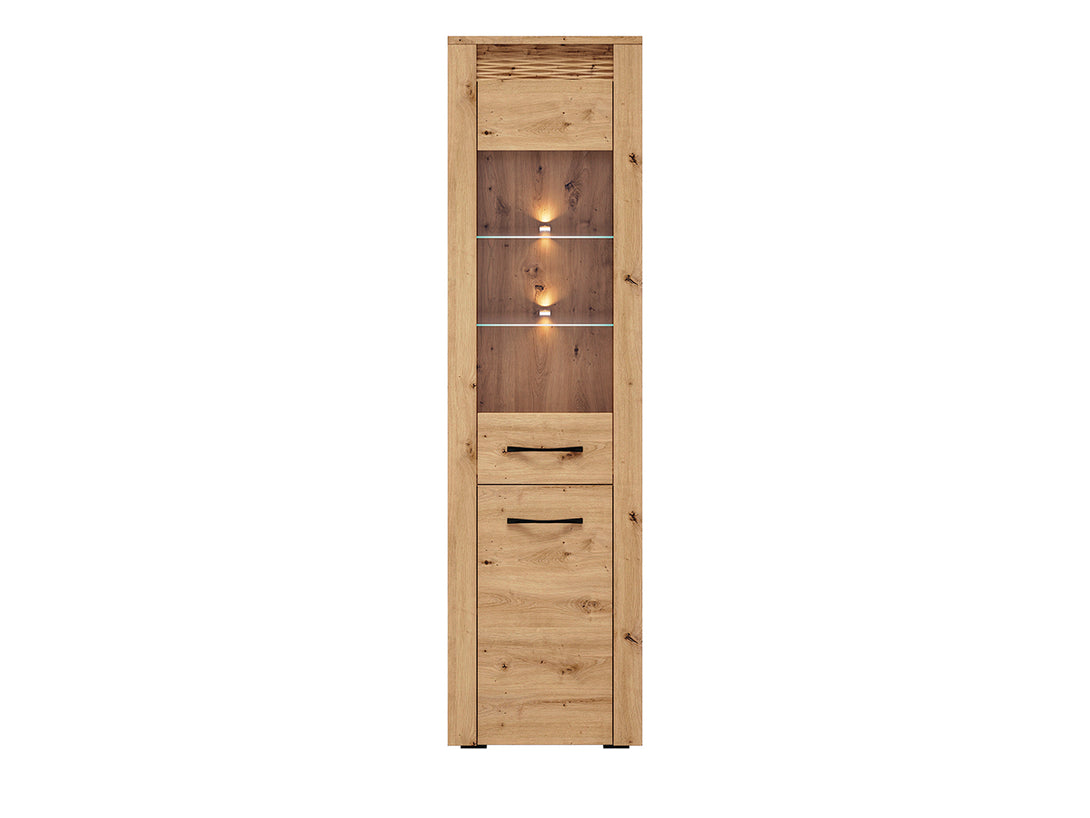 Die ARTIS 03 Vitrine überzeugt durch modernes Design und hochwertige Laminatoberflächen in Artisan Eiche mit MDF-Fronten. Sie bietet großzügigen Stauraum und präsentiert Ihre Lieblingsstücke stilvoll dank drei Glasregalen mit optionaler Beleuchtung. Die ABS-ummantelten Kanten sorgen für hohe Robustheit und Langlebigkeit.
