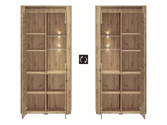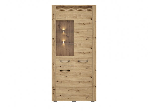 Die ARTIS 04 Vitrine vereint modernes Design mit praktischer Funktionalität und ist ideal für stilvolle Wohnräume. Die Kombination aus hochwertiger Laminatplatte in Artisan Eiche und MDF-Zierleisten schafft ein edles Erscheinungsbild mit natürlicher Ausstrahlung. Drei integrierte Glasregale bieten die perfekte Bühne für Ihre dekorativen Objekte und können optional beleuchtet werden.