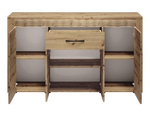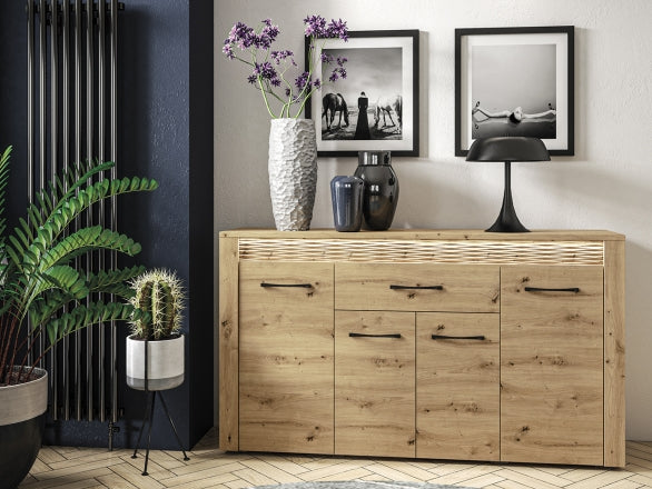 Gefertigt aus langlebigen Materialien wie MDF und laminierten Spanplatten, überzeugt die Serie ARTIS durch ihre feine Verarbeitung, ABS-Kanten sowie dekorative MDF-Riffelungen in Eichenoptik. Die Vitrine punktet zusätzlich mit integrierter LED-Beleuchtung und gehärtetem Glas, während die Kommode mit Vollauszugsschubladen ausgestattet ist – ein Qualitätsmerkmal für höchsten Wohnkomfort.