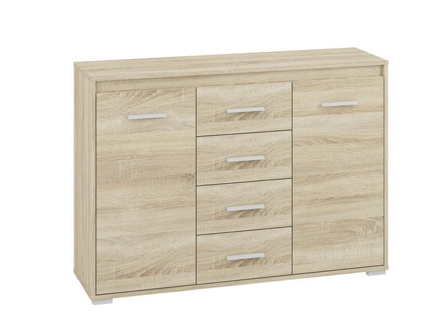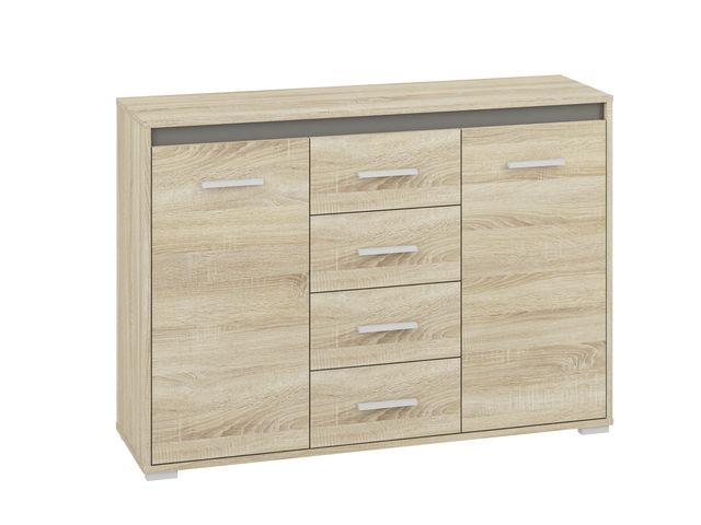Die AVO 14 Kommode kombiniert modernes Design mit praktischer Funktionalität und ist eine stilvolle Ergänzung für jedes Wohn- oder Schlafzimmer. Aus hochwertiger laminierter Spanplatte gefertigt und mit langlebigen ABS-Kanten versehen, überzeugt dieses Möbelstück durch Widerstandsfähigkeit gegenüber Kratzern, Feuchtigkeit und Hitze. Drei mitgelieferte Farbapplikationen – Weiß, Anthrazit und Sonoma Hell – ermöglichen individuelle Gestaltungsmöglichkeiten und bringen frischen Wind in Ihre Einrichtung. Mit zwei Türen und drei zentralen Schubladen bietet sie großzügigen Stauraum für Kleidung, Dokumente oder Wohnaccessoires.