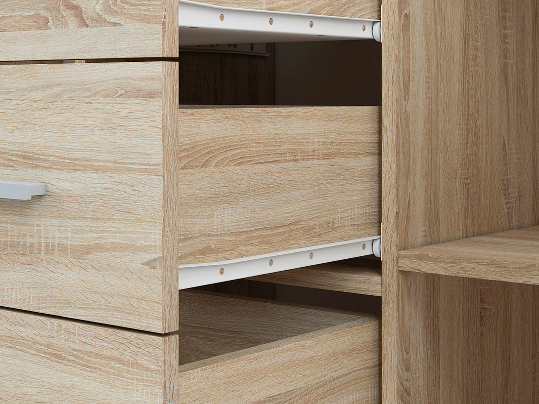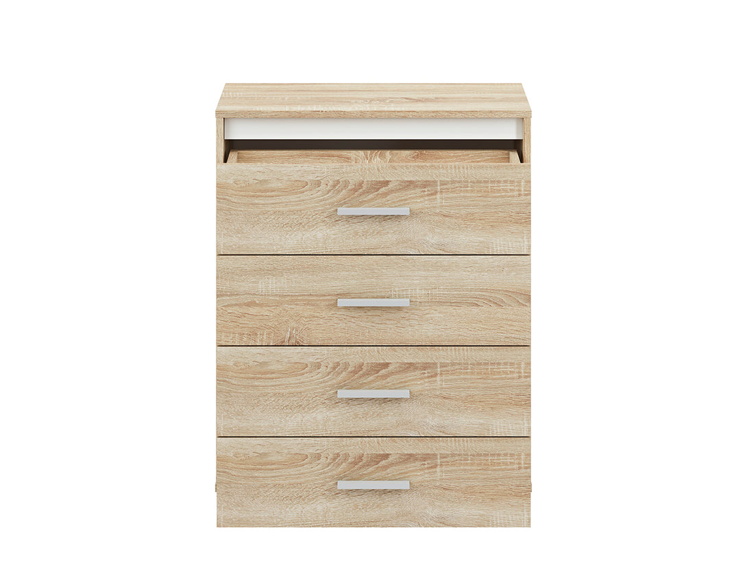 Die AVO 15 Kommode vereint modernes, minimalistisches Design mit funktionaler Aufbewahrung in kompakter Form. Gefertigt aus hochwertiger, laminierter Spanplatte und verstärkt mit robusten ABS-Kanten, ist dieses Möbelstück besonders widerstandsfähig gegenüber Kratzern und Feuchtigkeit. Mit einer Tür und drei praktischen Schubladen eignet sich die Kommode ideal für kleine Räume oder als Ergänzung im Wohn-, Schlaf- oder Arbeitszimmer. Drei im Lieferumfang enthaltene Einsätze in Weiß, Anthrazit und Sonoma Hell erlauben individuelle Farbakzente, passend zur Einrichtung.