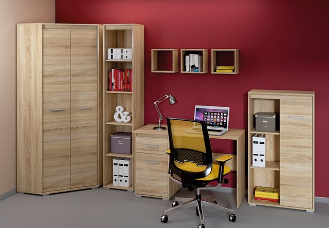 Das AVO Set besteht aus vier funktionalen Möbelstücken: einem modernen zweitürigen Schwebetürenschrank (AVO 04), einem schmalen Regalschrank für kompakte Räume (AVO 07), einer praktischen Kommode mit Schubladen (AVO 10) und einem funktionalen Schreibtisch (AVO 08). Die Regale sind nicht im Set enthalten, wodurch eine klare, platzsparende Lösung für moderne Wohnkonzepte entsteht. Die Kombination aus Sonoma-Holzoptik mit optionalen anthrazitfarbenen Einsätzen sorgt für ein zeitloses und wohnliches Design. Robuste Materialien wie laminierte Spanplatten und ABS-Kanten garantieren Langlebigkeit und einfache Pflege.