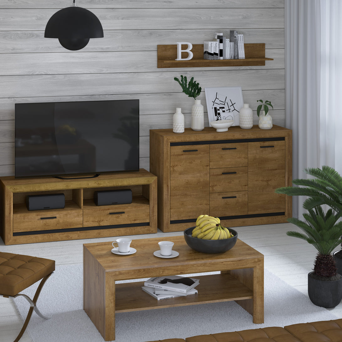 Das BALTICA Wohnzimmer-Set überzeugt mit einem stilvollen und zeitlosen Design in Dąb Lefkas und Schwarz, das Eleganz und Wärme in jeden Wohnraum bringt. Die hochwertige Verarbeitung mit ABS-Kanten und laminierten Platten sorgt für Langlebigkeit und Stabilität, während die durchdachte Gestaltung maximale Funktionalität bietet. Das Set besteht aus einer geräumigen Kommode, einem eleganten Couchtisch, einem praktischen TV-Schrank mit Schubladen in Vollauszug sowie einem Wandregal – ideal für ein modernes Wohnkonzept.