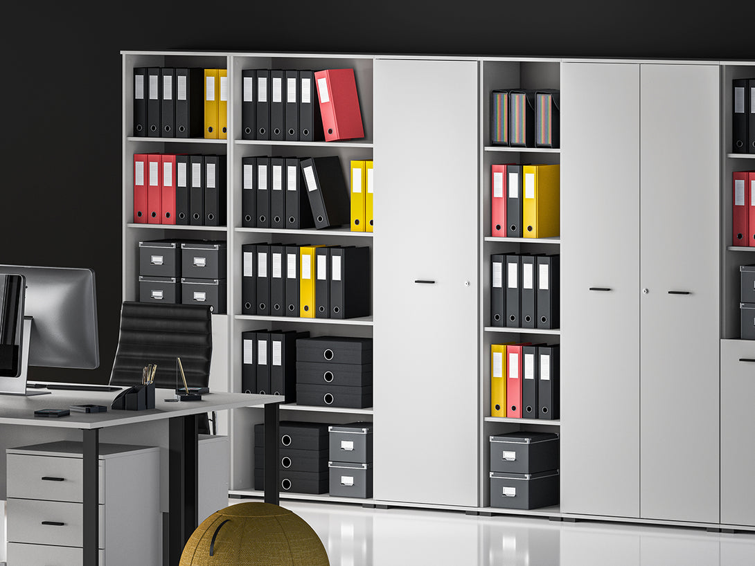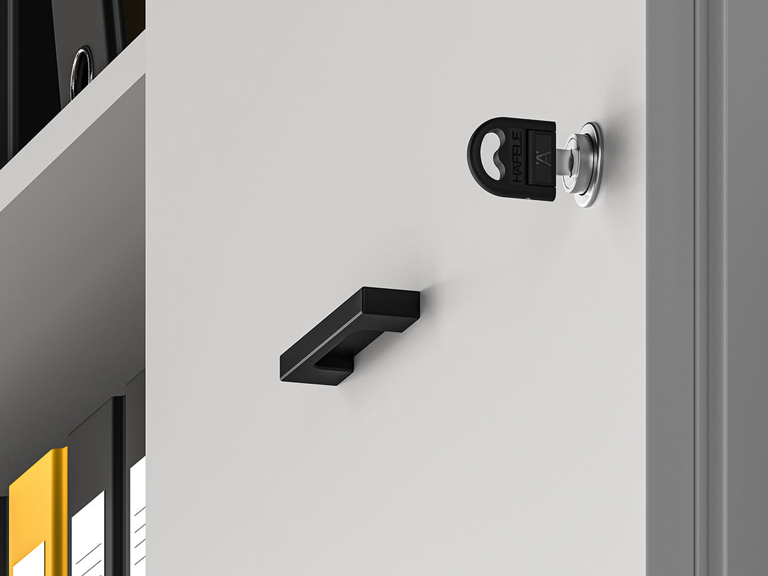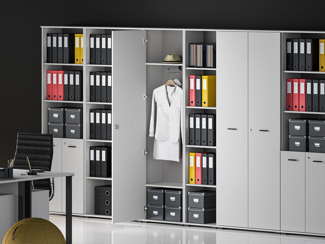 Aus robuster, laminiert Spanplatte gefertigt und mit strapazierfähigen ABS-Kanten versehen, bietet dieser Schrank langlebige Qualität. Die integrierte Schlossfunktion erhöht die Sicherheit und eignet sich besonders für den Einsatz in Gemeinschaftsräumen oder Büros.
