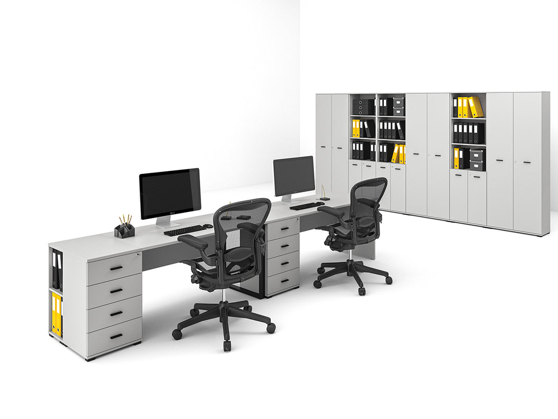 Das BARDO Office Set umfasst fünf perfekt aufeinander abgestimmte Möbelstücke, die gemeinsam eine durchdachte und stilvolle Büroeinrichtung ergeben. Mit zwei unterschiedlich breiten Bücherregalen, einem großzügigen Schreibtisch, einem Container mit Vollauszug und einem zusätzlichen Regalelement mit geringer Breite bietet dieses Set maximale Funktionalität auf kleinem Raum. Die silbergraue Oberfläche in Kombination mit hochwertigen Materialien und ABS-Kanten verleiht dem Set ein modernes und professionelles Erscheinungsbild, das sich ideal für Arbeitszimmer, Büros oder Homeoffice eignet.