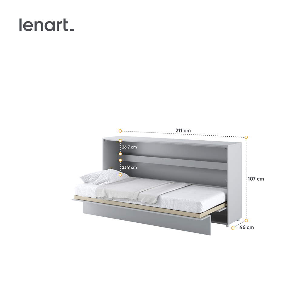Die kompakte Bauweise macht dieses Bett zur perfekten Wahl für kleine Räume, Gästezimmer oder Studios. Dank hochwertiger Materialien wie laminierter Spanplatte, MDF-Fronten und ABS-Kanten ist das Bett besonders langlebig, pflegeleicht und widerstandsfähig gegen Feuchtigkeit und Kratzer. Der Soft-Close-Mechanismus gewährleistet ein nahezu geräuschloses Schließen.