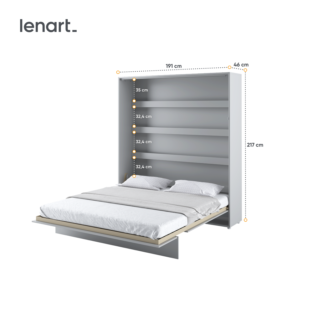 Das Bed Concept vertikale Schrankbett ist die perfekte Lösung für alle, die modernen Wohnkomfort und multifunktionale Raumgestaltung miteinander vereinen möchten. Die stabile Konstruktion aus Metallrahmen, MDF-Fronten und ABS-Kanten garantiert eine sichere und langlebige Nutzung. Pneumatische Hebevorrichtungen ermöglichen ein müheloses und sicheres Öffnen und Schließen. Die integrierte Soft-Close-Funktion sorgt zusätzlich für leises und angenehmes Handling.