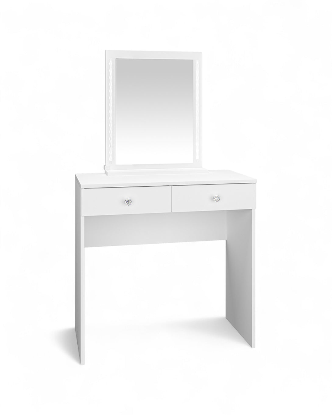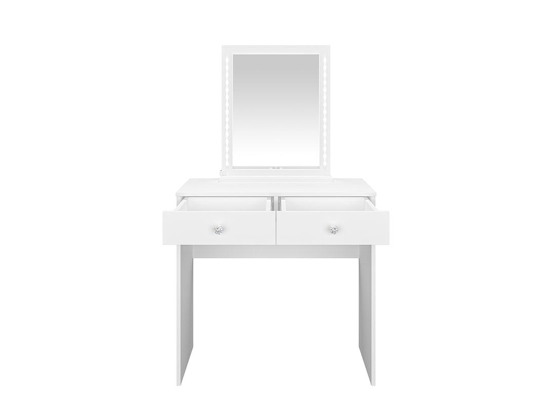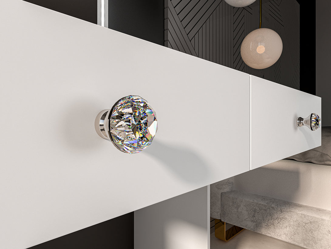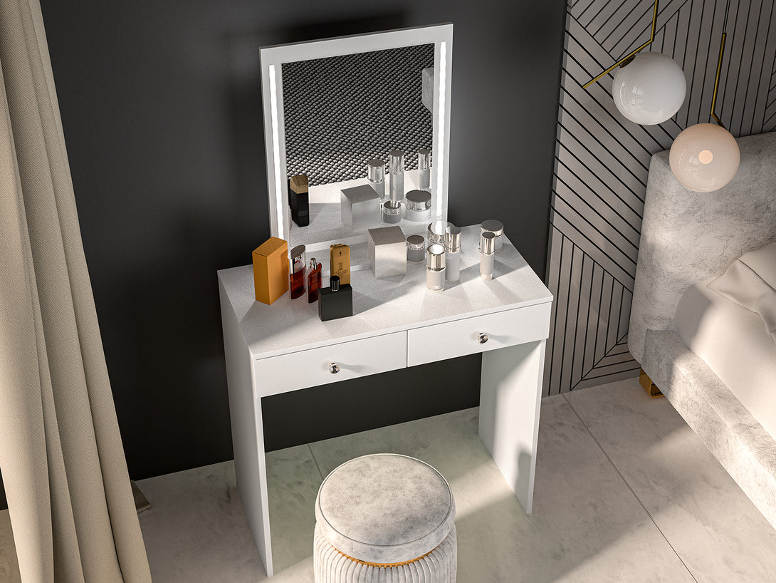 BIJOU 01 Schminktisch präsentiert sich in eleganter Glamour-Optik und schafft ein stilvolles Ambiente für Ihre tägliche Schönheitsroutine oder als dekorative Konsole im Schlafzimmer. Die Kombination aus modernem Design, feiner Formensprache und silbernen Griffen mit diamantähnlichen Steinen unterstreicht seine exklusive Ausstrahlung und macht ihn zu einem echten Highlight in jeder Einrichtung. Dank der großzügigen Arbeitsfläche, zwei geräumigen Schubladen und einem Spiegel mit integrierten LED-Lichtleisten bietet der Schminktisch optimale Funktionalität und Komfort. Die durchdachte Konstruktion ermöglicht das platzsparende Verstauen eines Hockers unter dem Tisch, wodurch sich BIJOU 01 auch für kleinere Räume bestens eignet. Seine hochwertige Verarbeitung garantiert Langlebigkeit und Stabilität über viele Jahre hinweg.