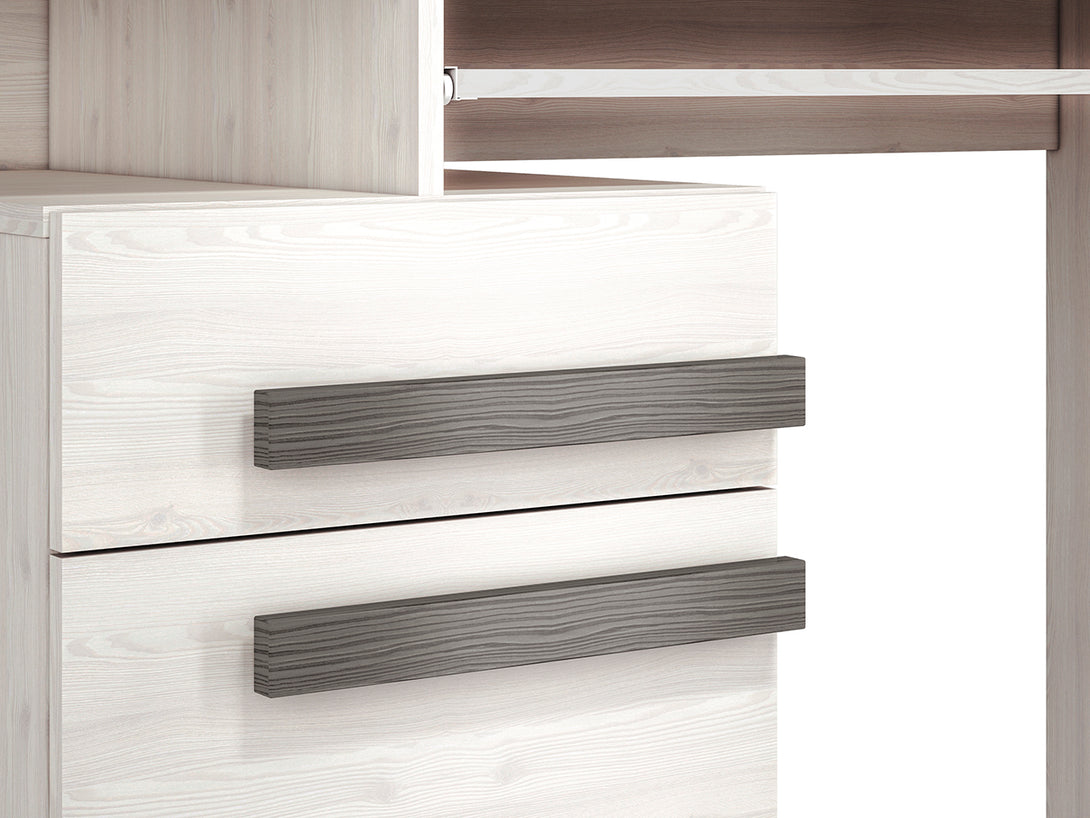 Das Set besteht aus einem geräumigen Kleiderschrank, einem praktischen Schreibtisch, einem Bettgestell (ohne Matratze), einer Kommode, einem Wandregal und einem Nachttisch. Durch das abgestimmte Design entsteht ein harmonischer Gesamteindruck, der sich sowohl für moderne als auch klassische Wohnkonzepte eignet.