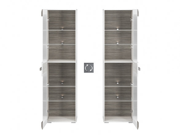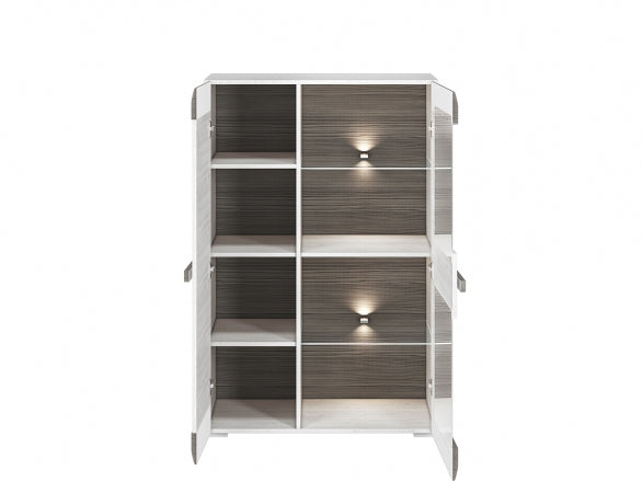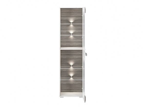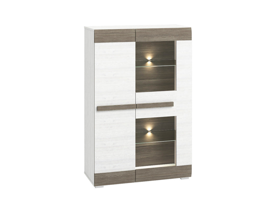 Die BLANCO Vitrine besticht durch ihr elegantes Design mit hochwertigem, zertifiziertem gehärtetem Glas und einer robusten Laminatplatte mit ABS-Kanten. Die Kombination aus Schneeeiche und MDF New Grey Fronten sorgt für eine moderne und zeitlose Optik, ideal für stilbewusste Wohnräume. Mit der optionalen Beleuchtung lassen sich Ihre Lieblingsstücke optimal in Szene setzen und schaffen ein angenehmes Ambiente.