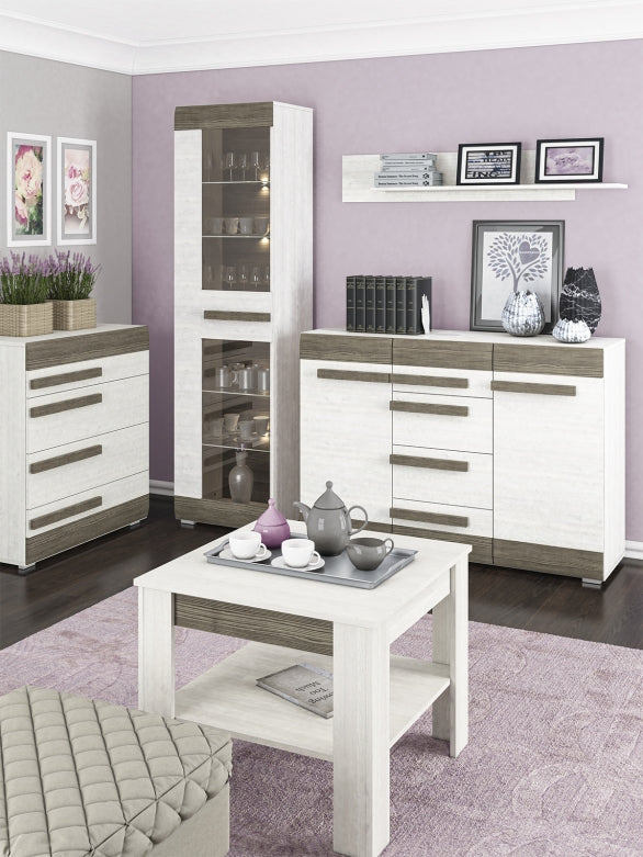 Das Set umfasst eine hohe Vitrine mit optionaler LED-Beleuchtung, zwei praktische Kommoden mit großzügigem Stauraum, ein quadratischer Couchtisch sowie ein modernes Wandregal. Die einheitliche Formensprache und die langlebigen Materialien machen dieses Set zur perfekten Wahl für stilbewusste Einrichtungen.