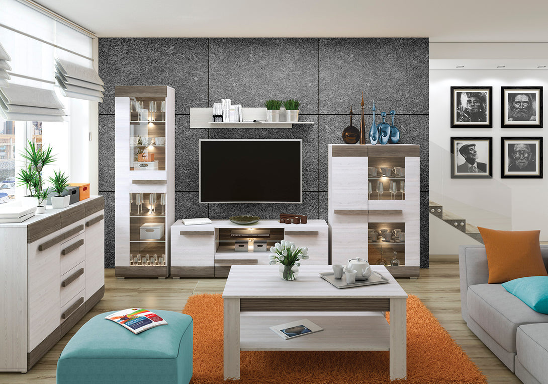 Das stilvolle Wohnzimmer-Set BLANCO vereint modernes Design mit funktionalen Eigenschaften und eignet sich ideal zur harmonischen Gestaltung zeitgemäßer Wohnräume. Mit einer ansprechenden Kombination aus strukturierter Holzoptik in Schnee-Kiefer und MDF in New Grey setzt dieses Ensemble elegante Akzente im Interieur.