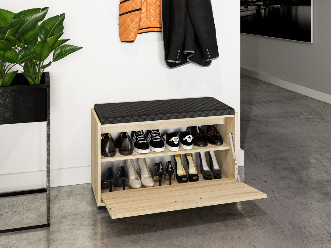 Der CARO 04 Schuhschrank bietet eine durchdachte Kombination aus Funktionalität und ästhetischem Design. Die helle Holzoptik in Sonoma Eiche verleiht Ihrem Eingangsbereich eine warme und einladende Atmosphäre und passt sich mühelos verschiedensten Einrichtungsstilen an.