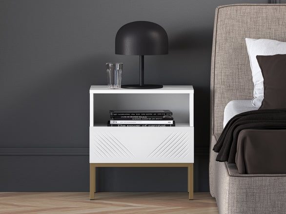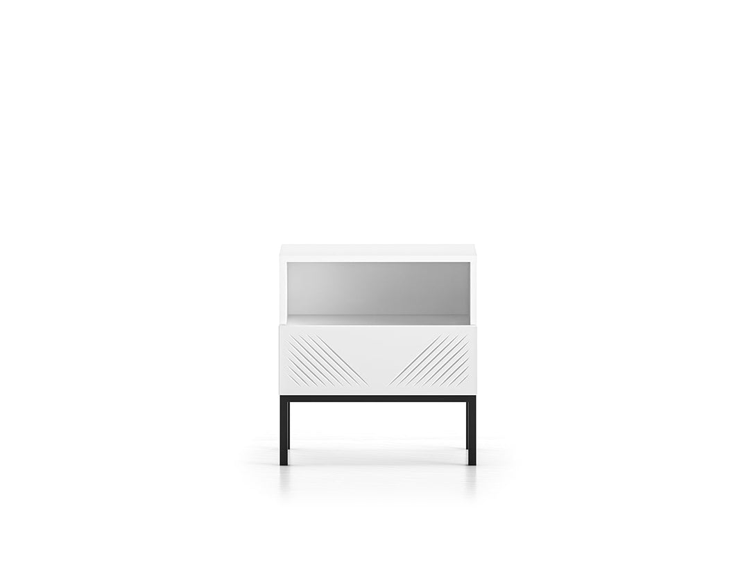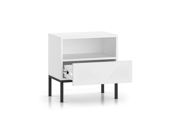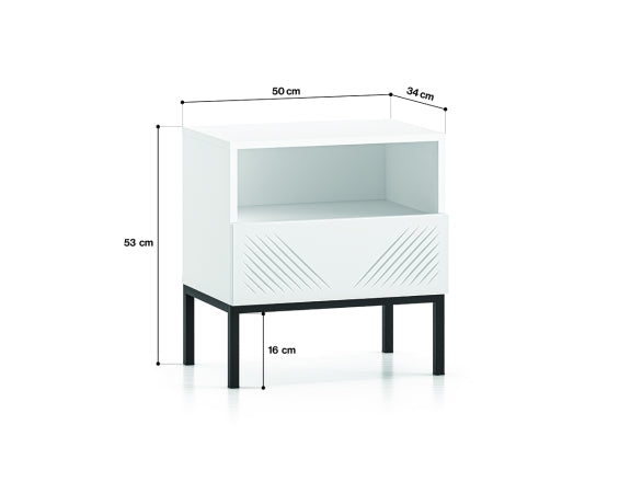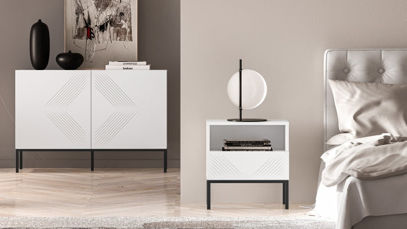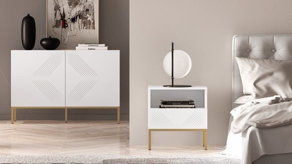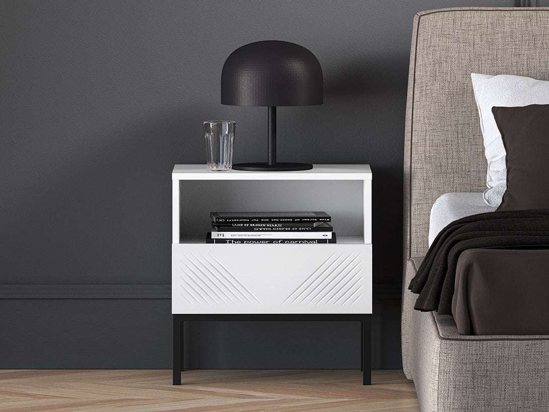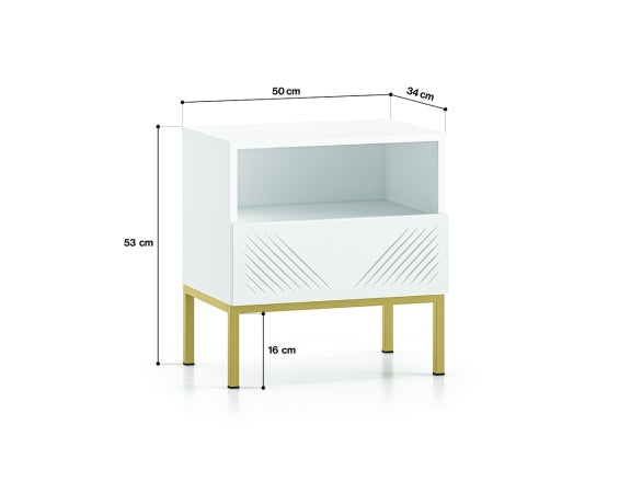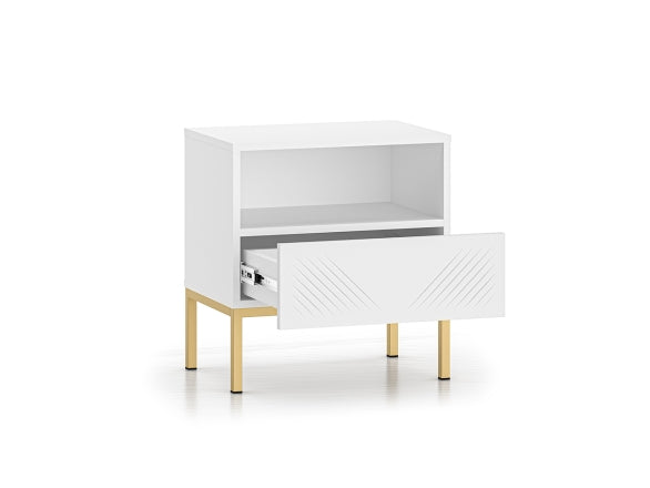 Der CLEARING 05 Nachttisch vereint modernes Design mit hoher Funktionalität. Die MDF-Front in Weiß Matt und die stabile Metallbasis in Schwarz oder Gold verleihen dem Möbelstück eine elegante Optik, die sich perfekt in verschiedene Einrichtungsstile einfügt. Das hochwertige, laminierte Holz mit ABS-Kanten sorgt für Strapazierfähigkeit sowie Feuchtigkeits- und Kratzbeständigkeit.