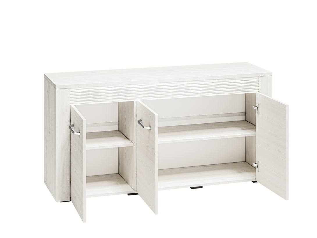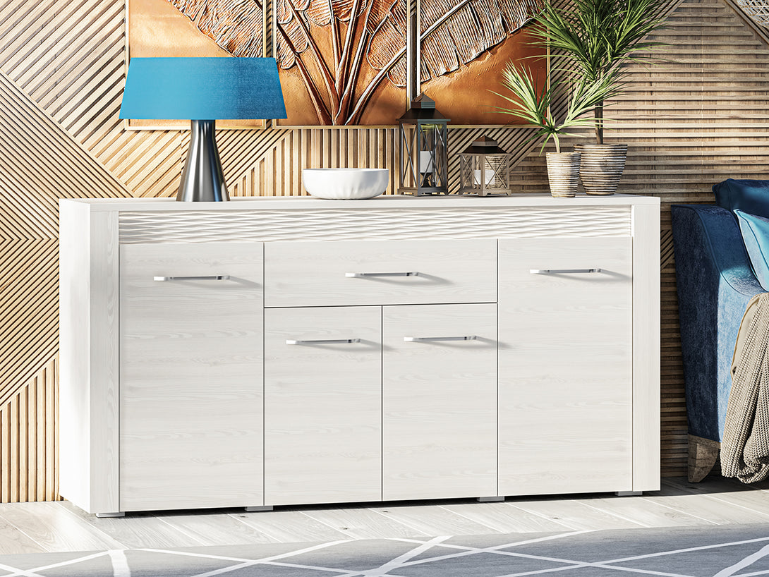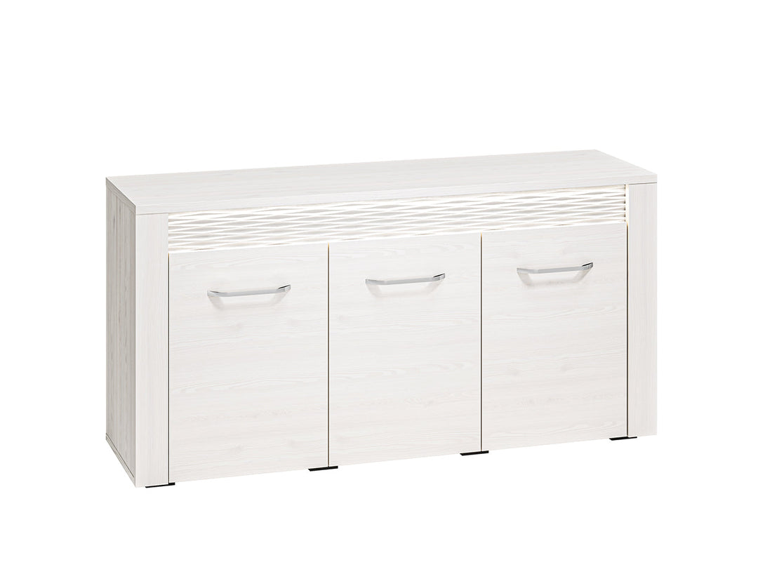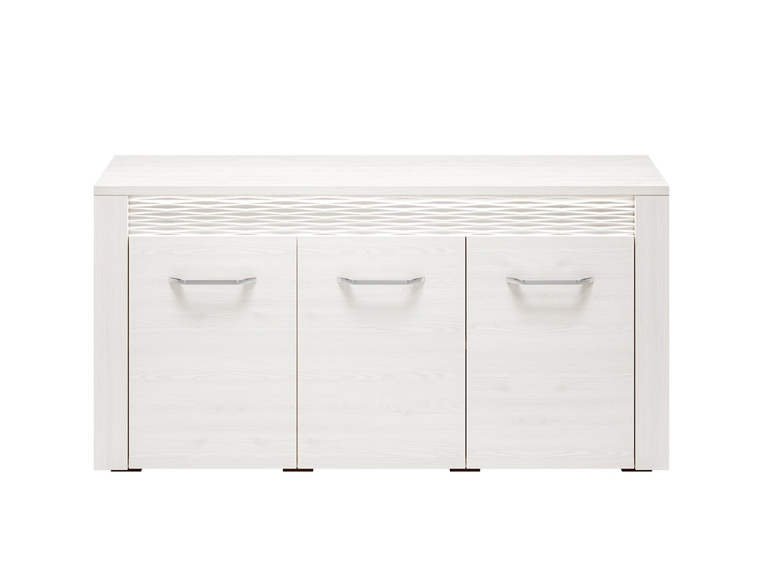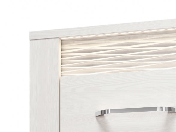 Die CLERMONT Kommode bietet mit ihrem großzügigen Design viel Stauraum und ein elegantes Erscheinungsbild. Die Kombination aus Snow Pine und MDF-Elementen sorgt für eine helle und freundliche Atmosphäre in jedem Raum. Dank der hochwertigen Laminatplatte, stoßfesten ABS-Kanten und robusten Schubladen mit Vollauszug und erhöhter Tragfähigkeit ist die Kommode besonders langlebig und funktional. Das integrierte Beleuchtungssystem unterstreicht das moderne Design und schafft ein stilvolles Wohnambiente.