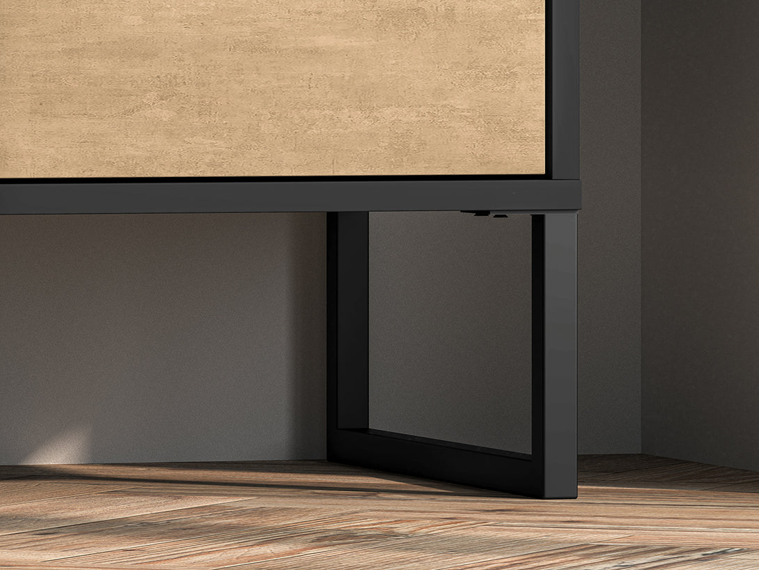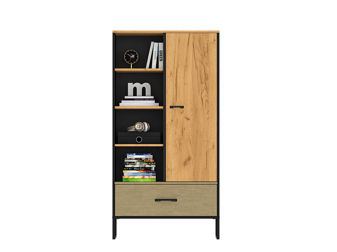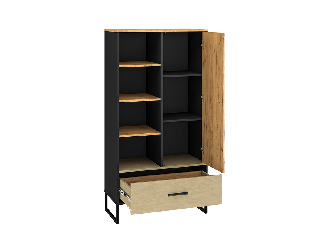 Das COLT 04 Regal besticht durch seine hochwertige laminierte Oberfläche in der Farbkombination Dąb Craft Złoty, Schwarz und Premium Stahl und überzeugt mit robusten ABS-Kanten für erhöhte Langlebigkeit. Mit einem durchdachten Design und vollem Schubladenauszug bietet es praktischen Stauraum bei kompakten Maßen. Dank der sorgfältigen Verarbeitung und modernen Farbgestaltung passt dieses Möbelstück ideal in zeitgemäße Wohn- und Arbeitsbereiche.