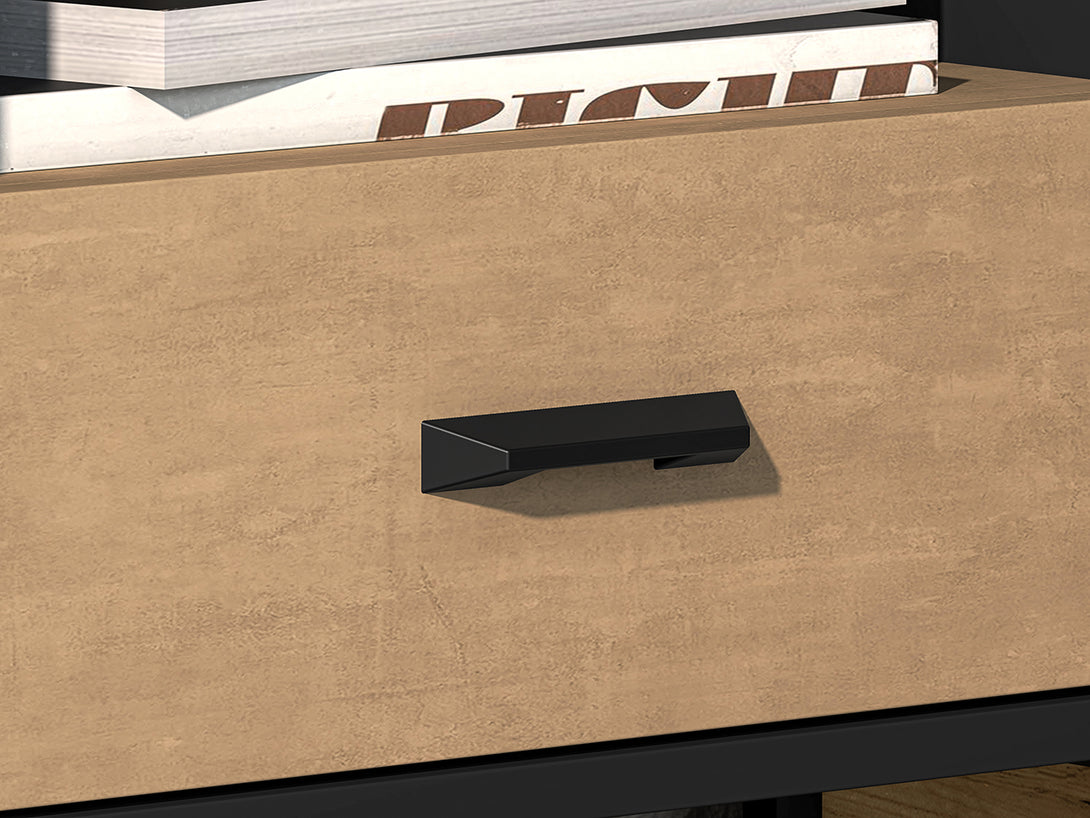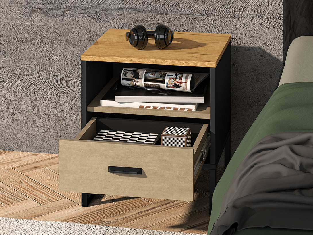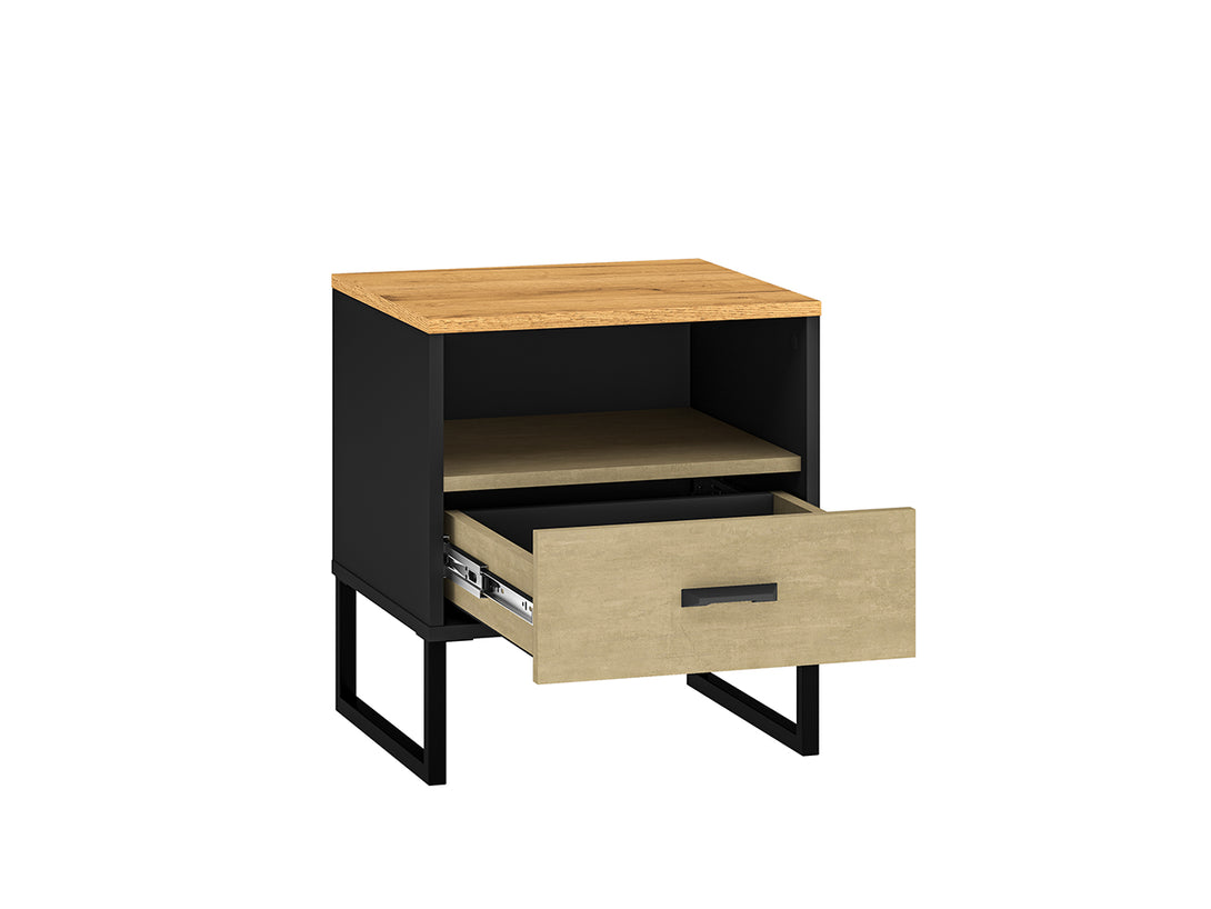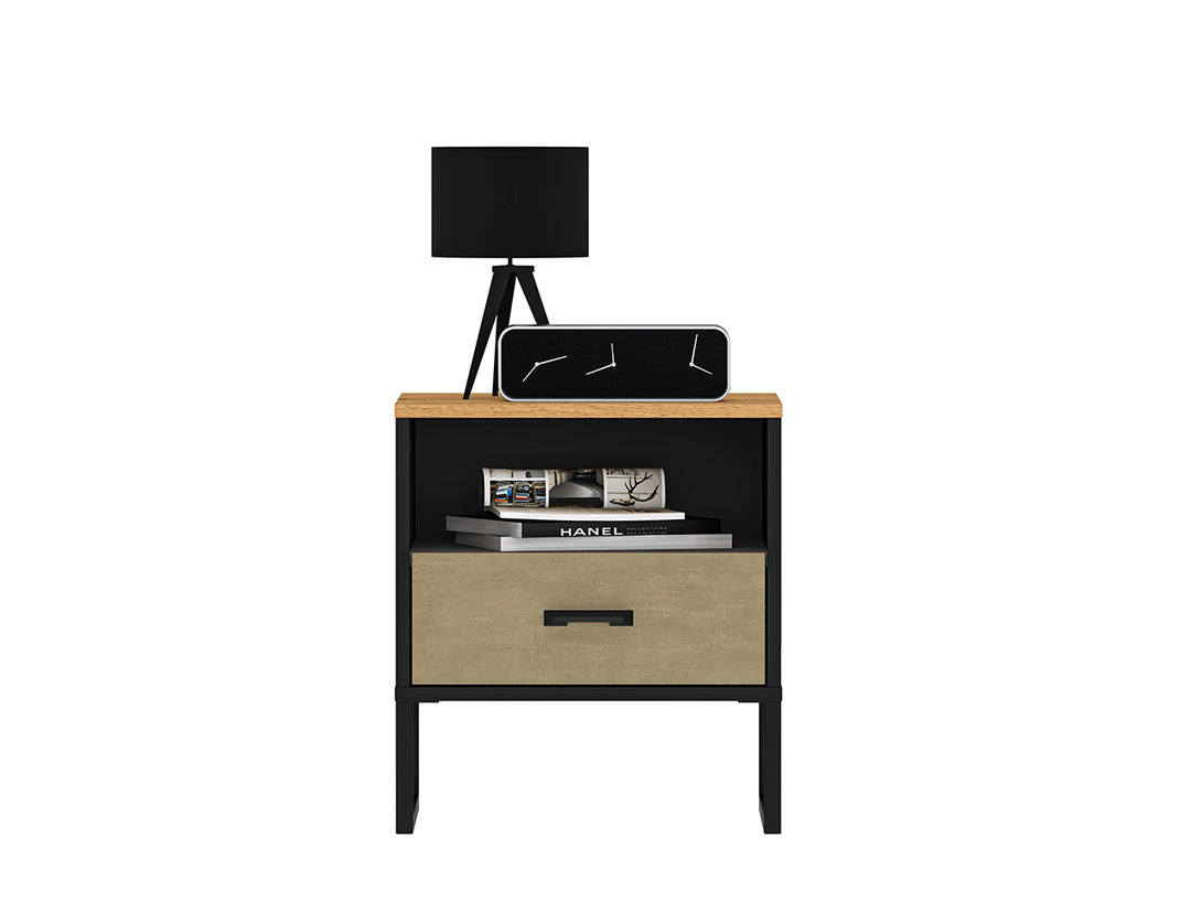 Der COLT 08 Nachttisch ist die perfekte Ergänzung für moderne Schlafbereiche. Mit seiner stilvollen Kombination aus Dąb Craft Złoty, schwarzem Akzent und Stahlelementen in Premiumqualität verleiht er jedem Raum ein elegantes Flair. Die hochwertige laminierte Oberfläche und die stabile ABS-Kante sorgen für eine langlebige und widerstandsfähige Nutzung.