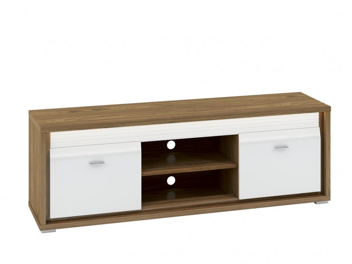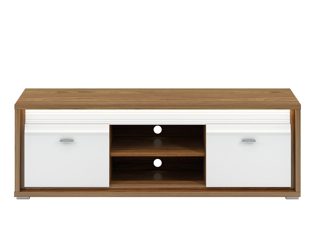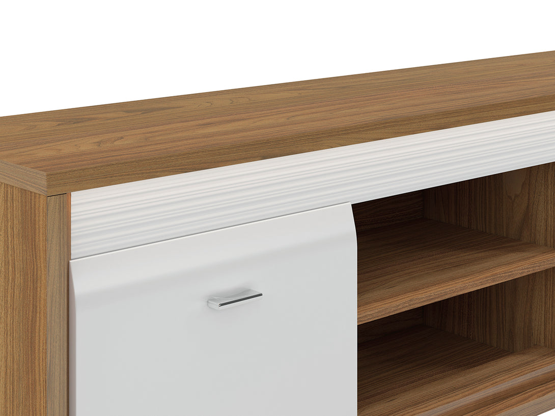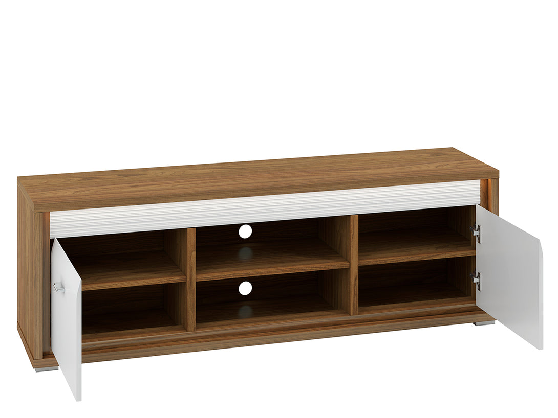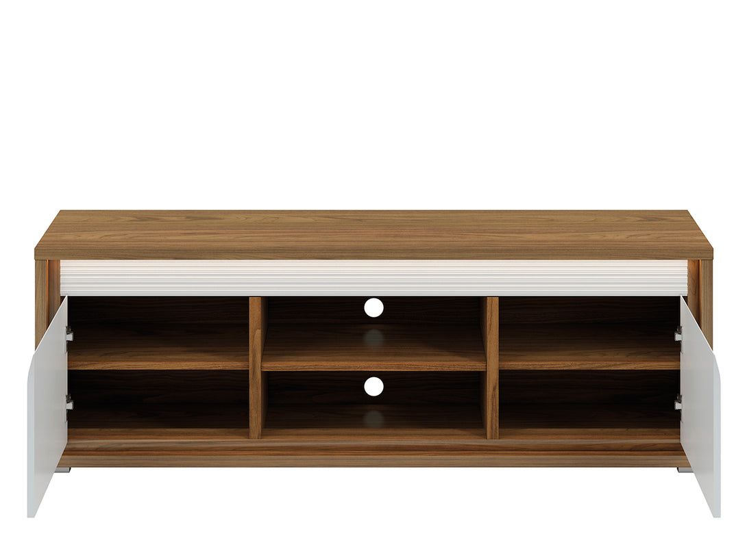 Der DALLAS 1101 TV-Schrank vereint elegantes Design mit praktischer Funktionalität. Die Kombination aus natürlichem Nussbaum und glänzenden weißen MDF-Fronten mit charakteristischer Riffelstruktur verleiht diesem Möbelstück einen modernen und stilvollen Look. Die integrierte Beleuchtung, die hochwertigen Materialien und das leise Soft-Close-System sorgen für ein komfortables und langlebiges Nutzungserlebnis.