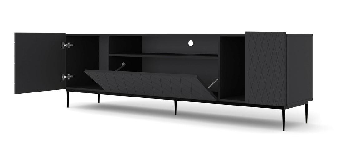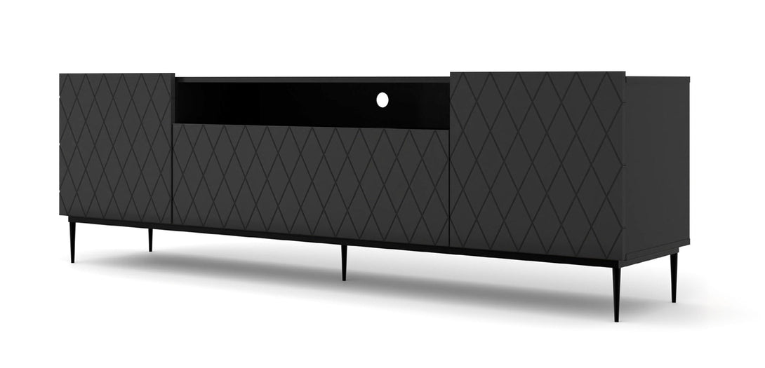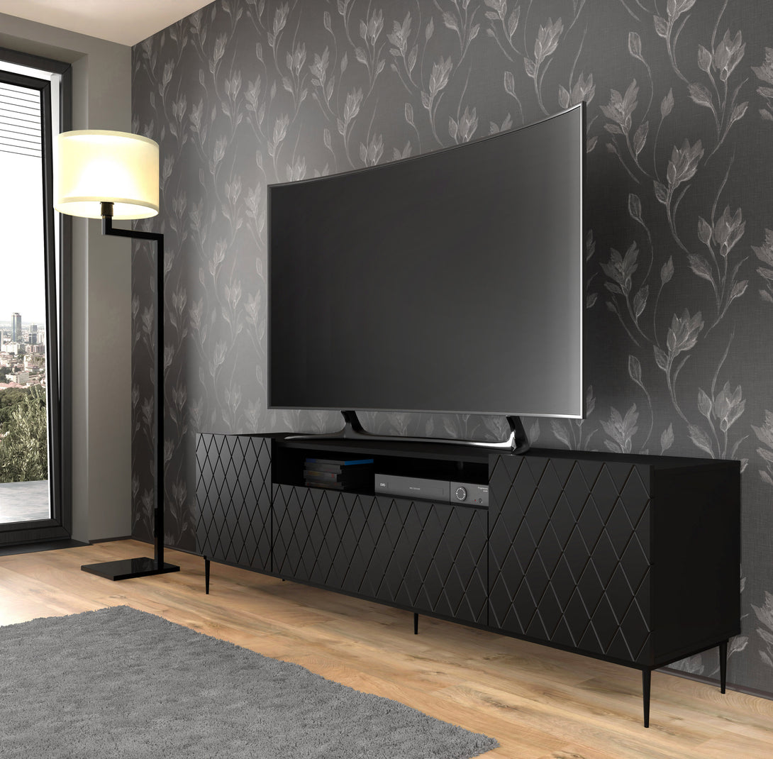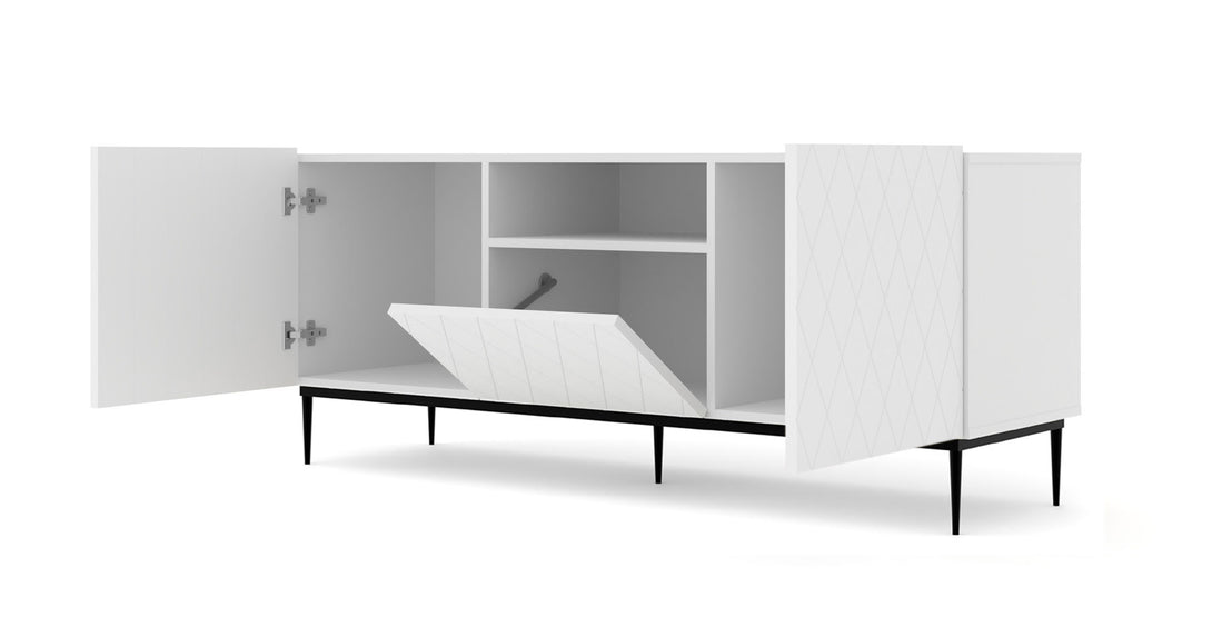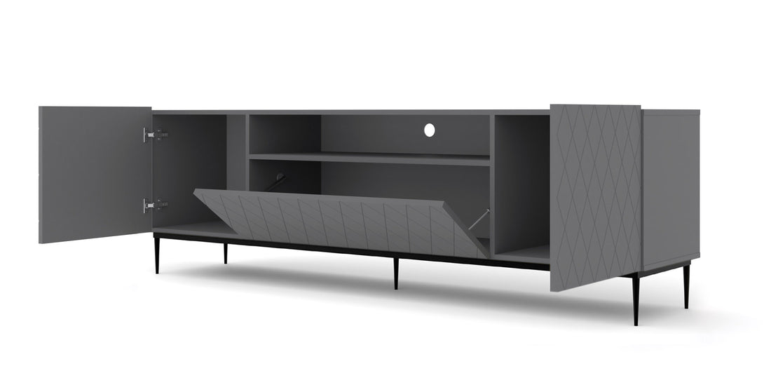 Der TV-Schrank DIUNA B verbindet modernes Design mit klassischer Eleganz und bietet eine stilvolle Lösung für Ihr Wohnzimmer. Die raffiniert verzierten Fronten in Kombination mit einem stabilen Metallrahmen sorgen für eine luxuriöse Ausstrahlung und machen das Möbelstück zu einem Blickfang in jeder Einrichtung.