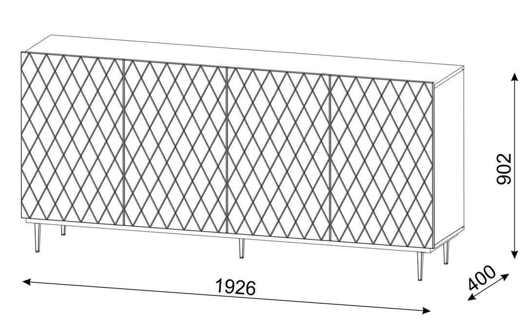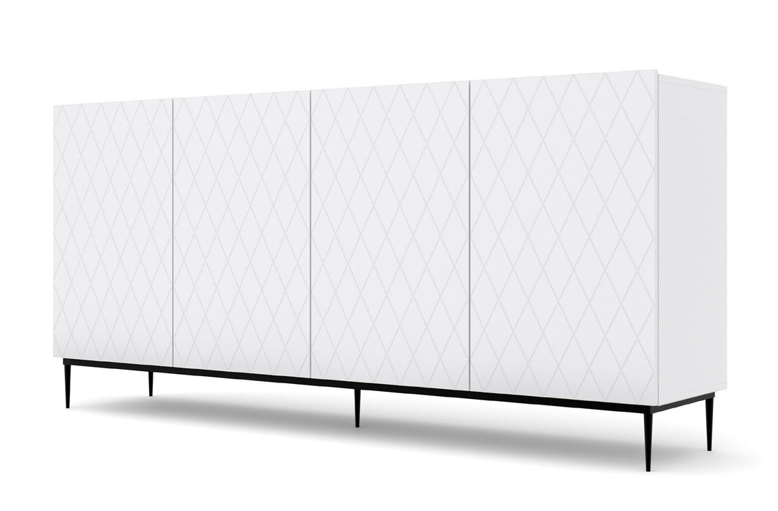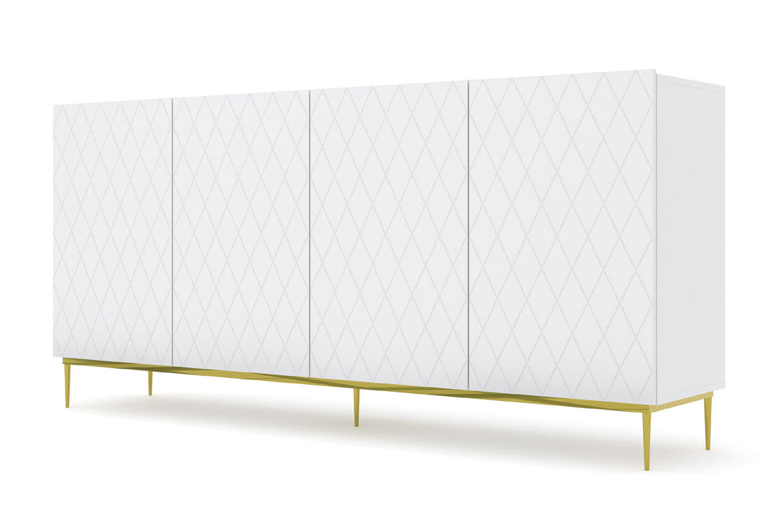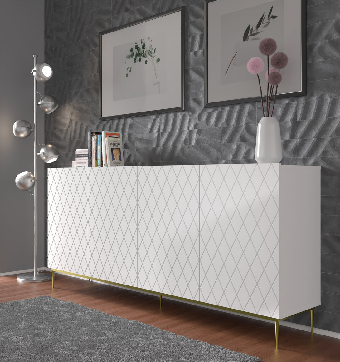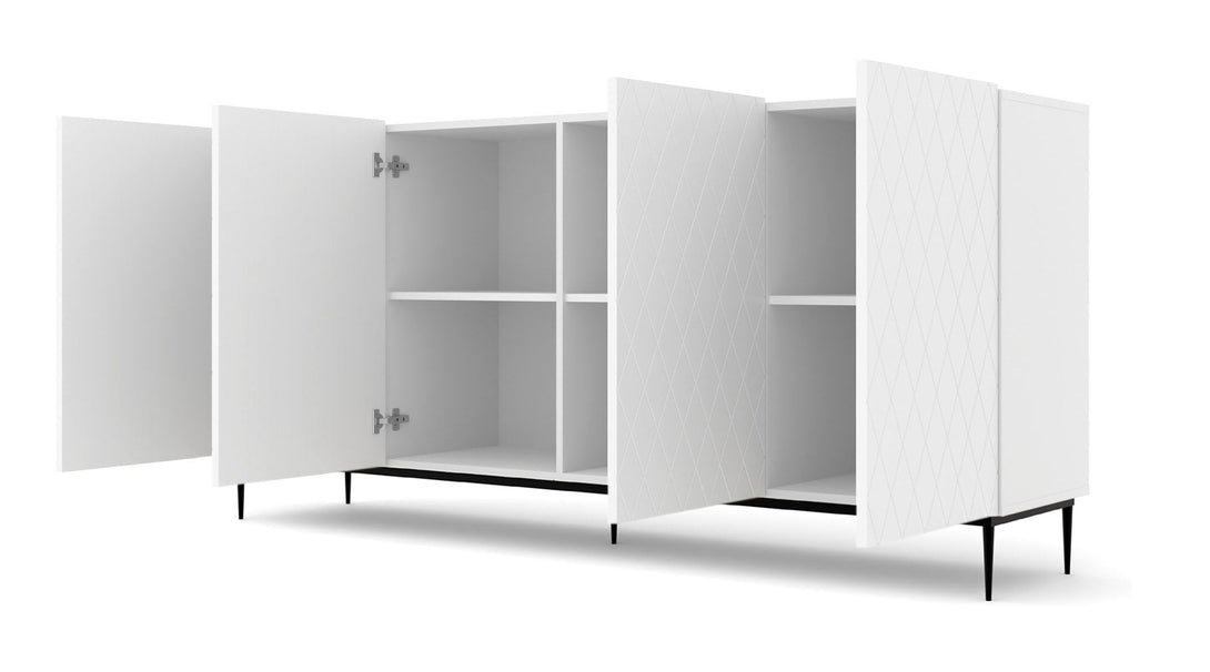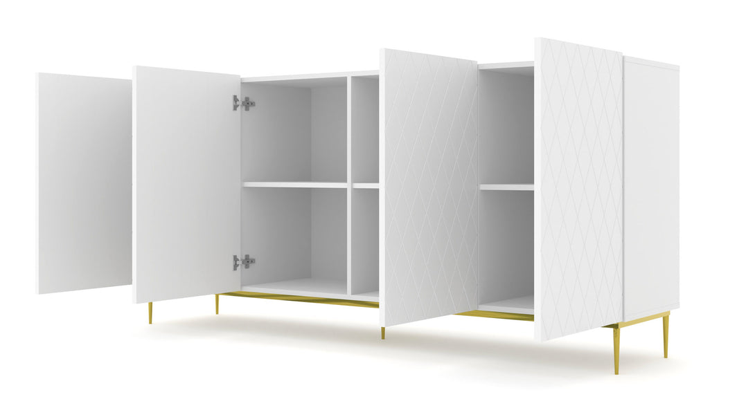 Mit vier verschließbaren Fächern bietet die Kommode großzügigen Stauraum für eine organisierte Aufbewahrung. Die robuste Konstruktion aus MDF und laminierten Platten sowie die stabilen Metallfüße sorgen für Langlebigkeit und festen Stand – ideal für Wohn- oder Essbereiche mit stilvollem Anspruch.