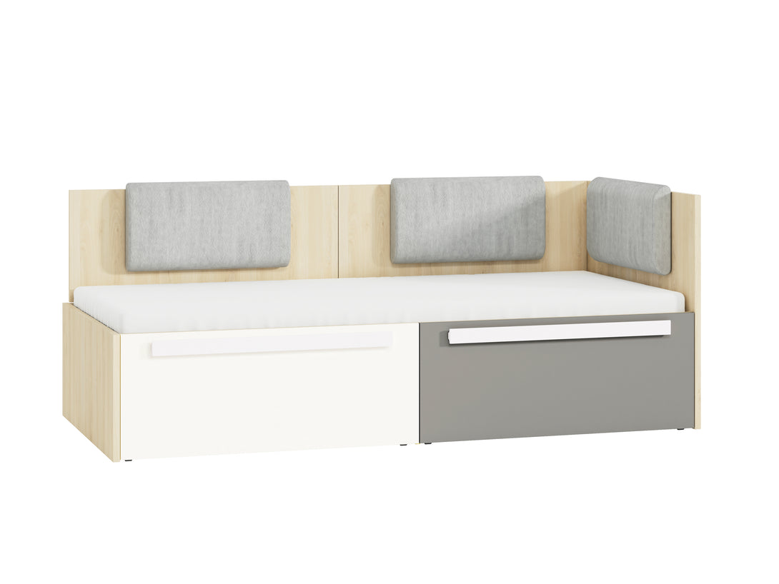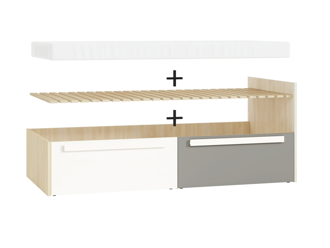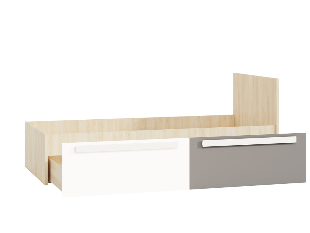 Das DROP 1702 Bettgestell überzeugt durch sein klares, skandinavisch inspiriertes Design mit geometrischen Griffen und einer harmonischen Farbkombination aus Buk Fjord, Weiß und Schrägrau (Szara Platyna). Die stabile Konstruktion aus hochwertiger, kratz- und feuchtigkeitsresistenter Laminatplatte sorgt für Langlebigkeit im Alltag, während die zwei geräumigen Schubladen unter der Liegefläche praktischen Stauraum für Bettwäsche oder Kleidung bieten. Das Bett ist ideal für Jugend- und Schlafzimmer, lässt sich einfach montieren und passt durch sein modernes Design in jeden Raum.