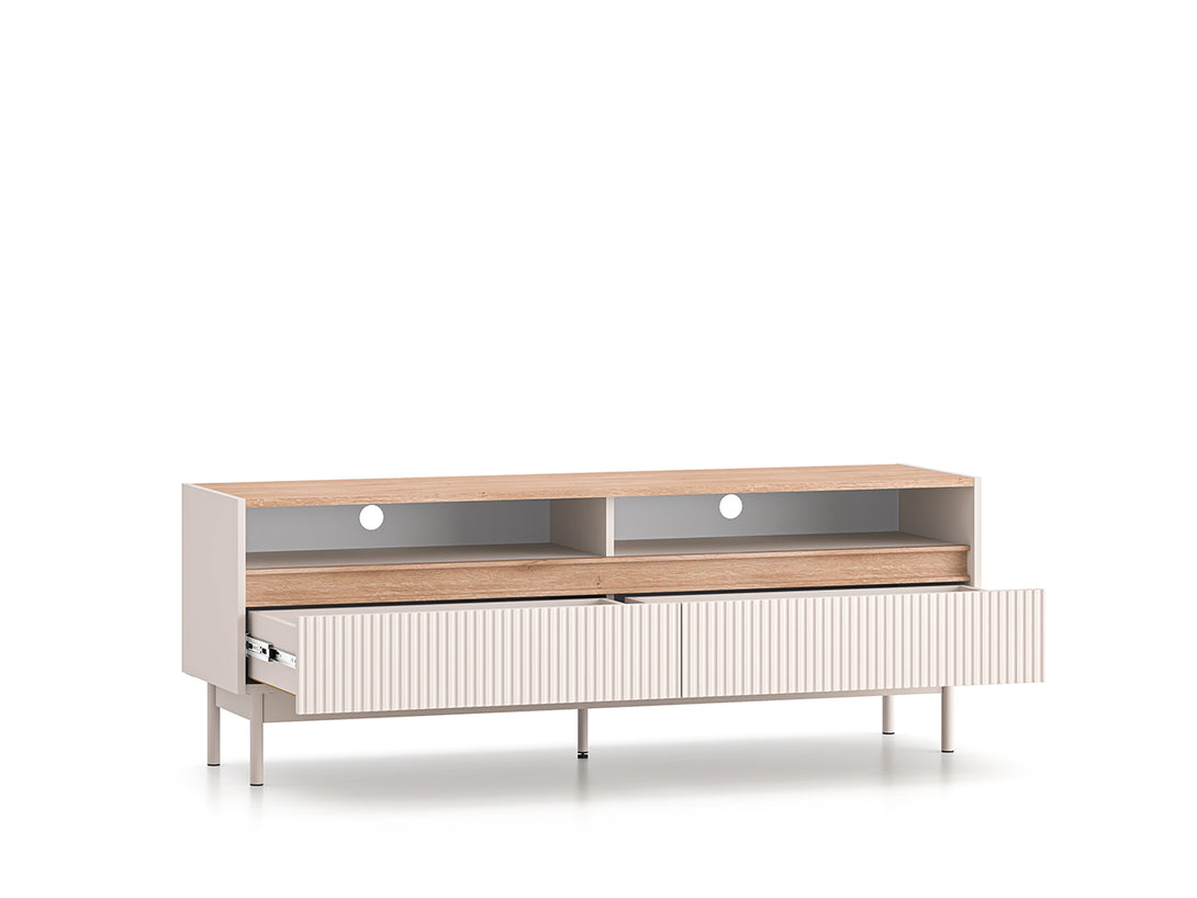 Die kaschmirfarbene Front in Kombination mit Eichenholzoptik verleiht dem Möbelstück einen modernen, eleganten Look. Metallfüße garantieren festen Stand und eine luftige Erscheinung. Die breite Oberplatte bietet Platz für Fernseher, Dekorationsartikel oder Sammlerstücke – perfekt für jedes stilvolle Zuhause.