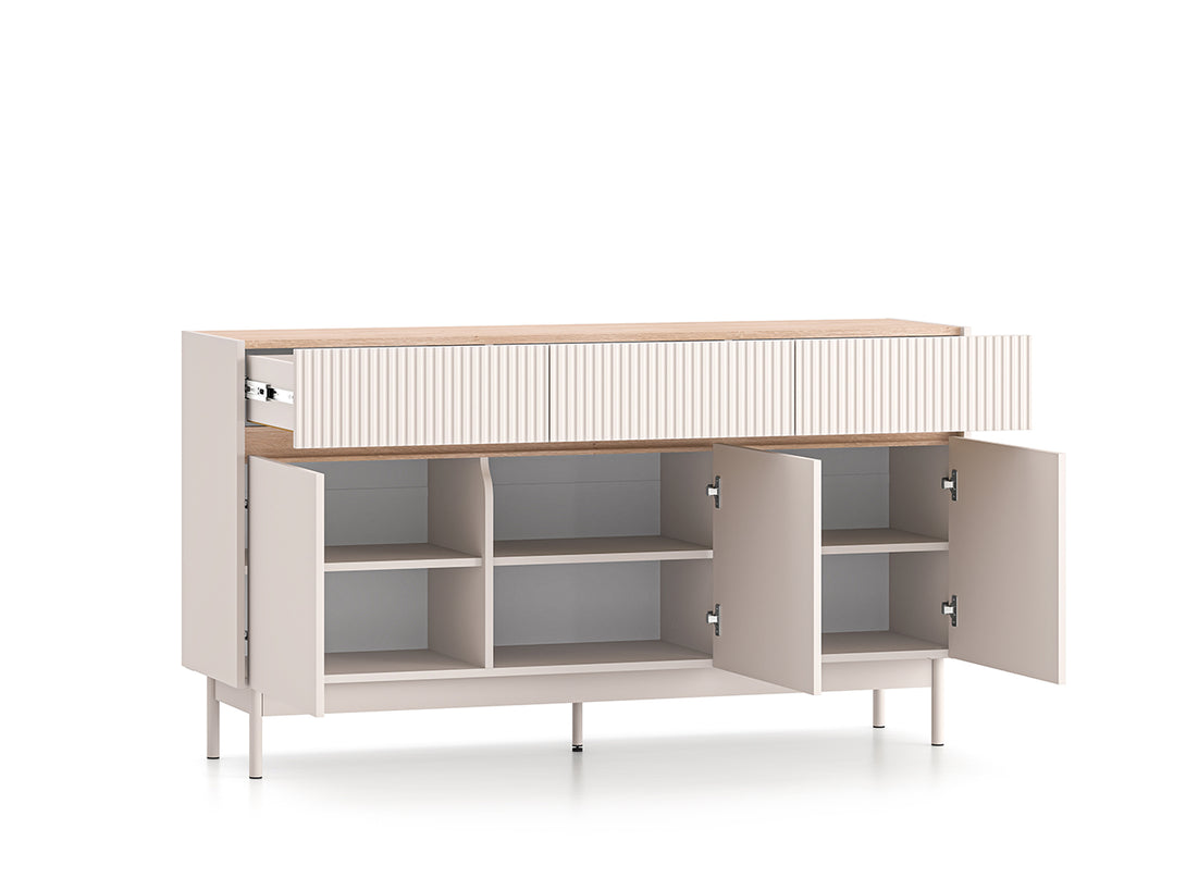 Die harmonische Kombination aus kaschmirfarbenen Fronten und natürlicher Eiche Cremona bringt Wärme und Eleganz in jeden Raum. Robuste Metallfüße, Soft-Close-Scharniere und langlebige Materialien machen das Set zu einer hochwertigen und langlebigen Einrichtungslösung.