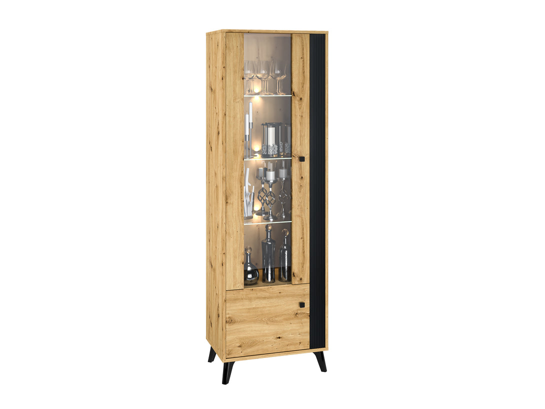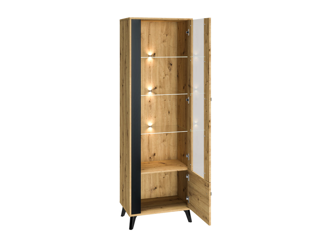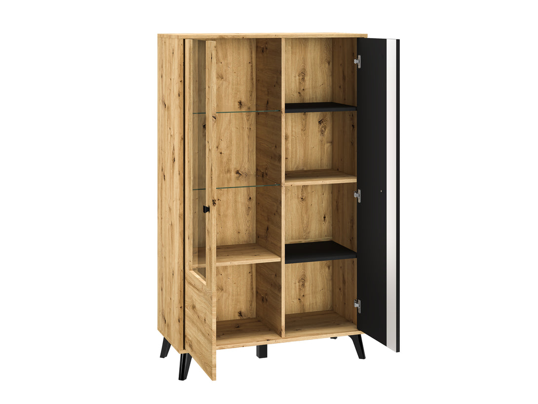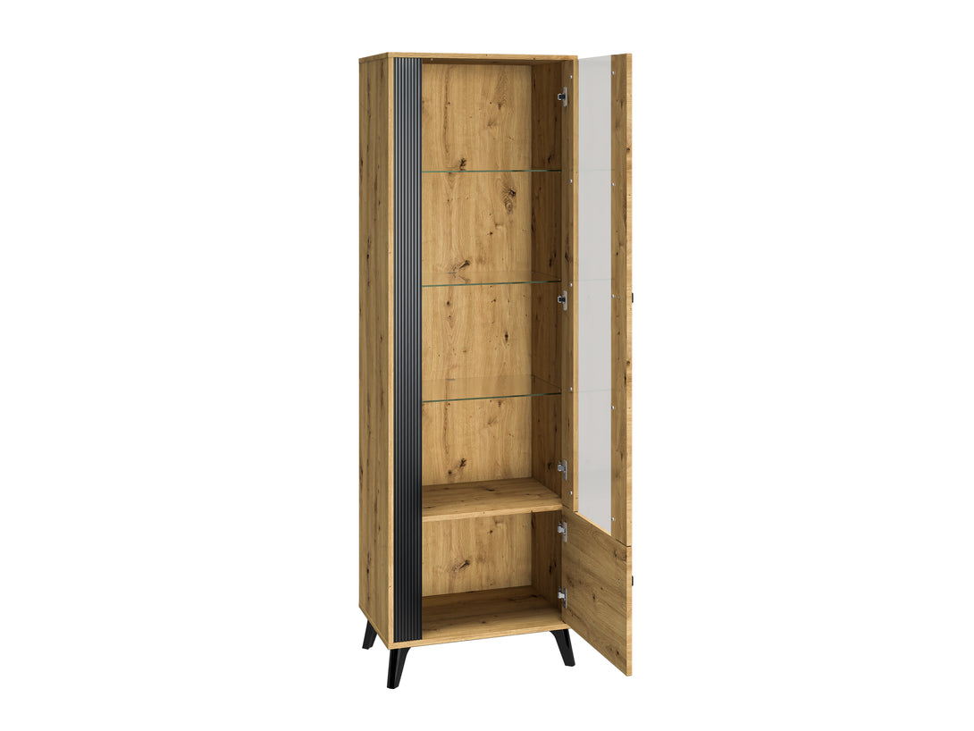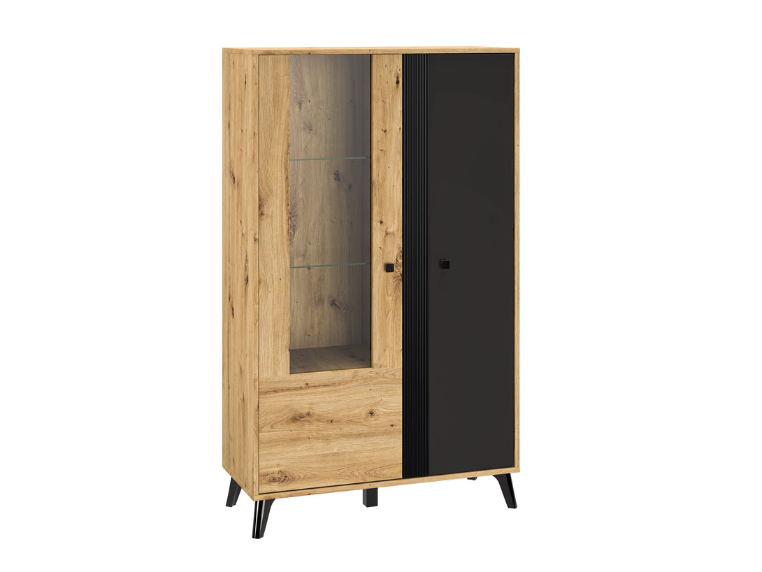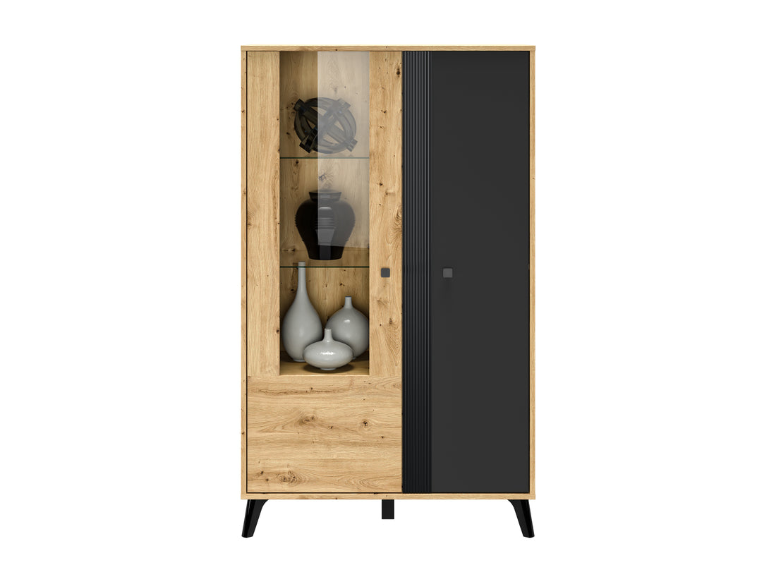 Die ELIZABETH Standvitrine überzeugt durch ihr stilvolles Design mit natürlicher Holzoptik und eleganten schwarzen Akzenten. Mit zwei unterschiedlichen Höhenvarianten fügt sie sich perfekt in moderne Wohnräume ein und bietet eine ideale Präsentationsfläche für Ihre Lieblingsstücke. Hinter der teils verglasten Front finden sich mehrere Fächer aus Glas und Holz, die sowohl funktional als auch dekorativ sind. Die stabile Konstruktion, hochwertige Materialien und eine klare Linienführung machen diese Vitrine zu einem langlebigen Möbelstück mit stilvoller Ausstrahlung.