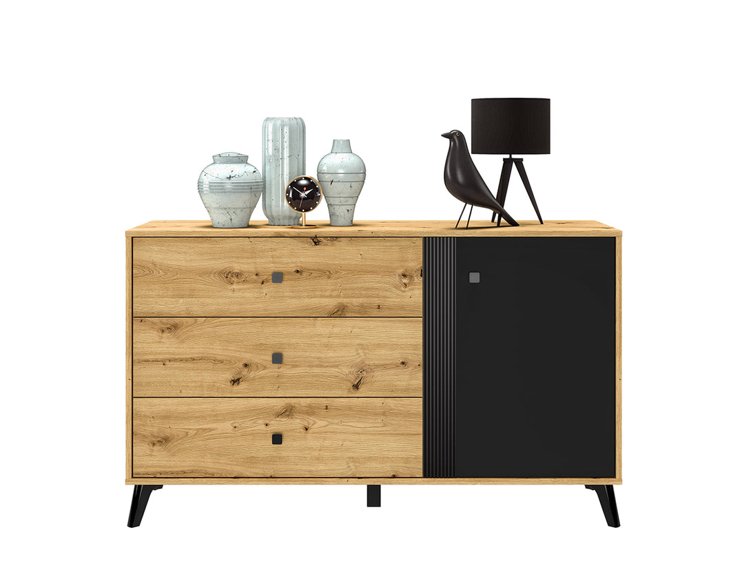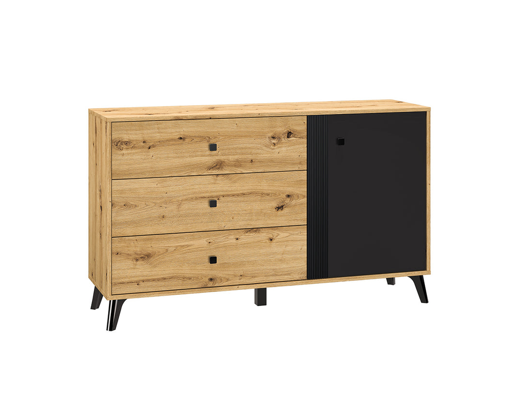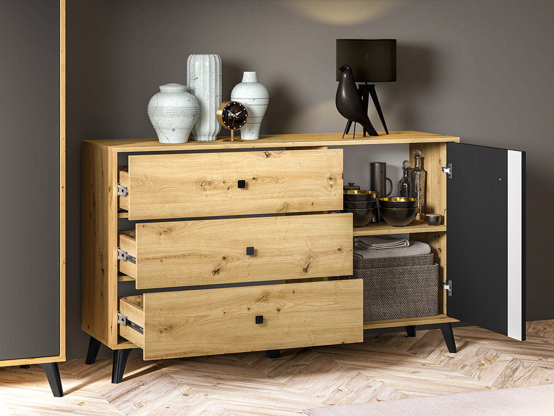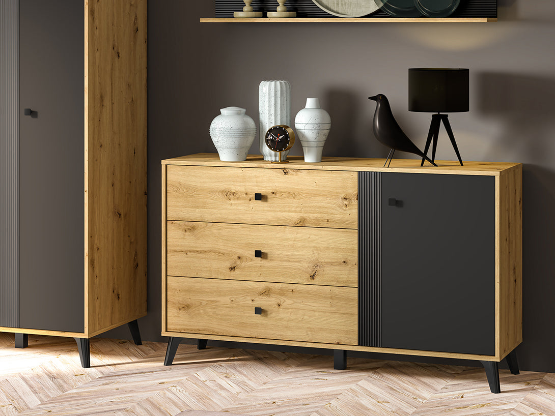 Das ELIZABETH Wohnzimmer-Set besteht aus einem modernen Kleiderschrank und einer stilvollen Kommode – die perfekte Kombination für stilvolle und gut organisierte Wohnräume. In Artisan Eiche mit schwarzen Details gestaltet, verleiht das Set jedem Interieur einen eleganten, zeitgemäßen Touch.