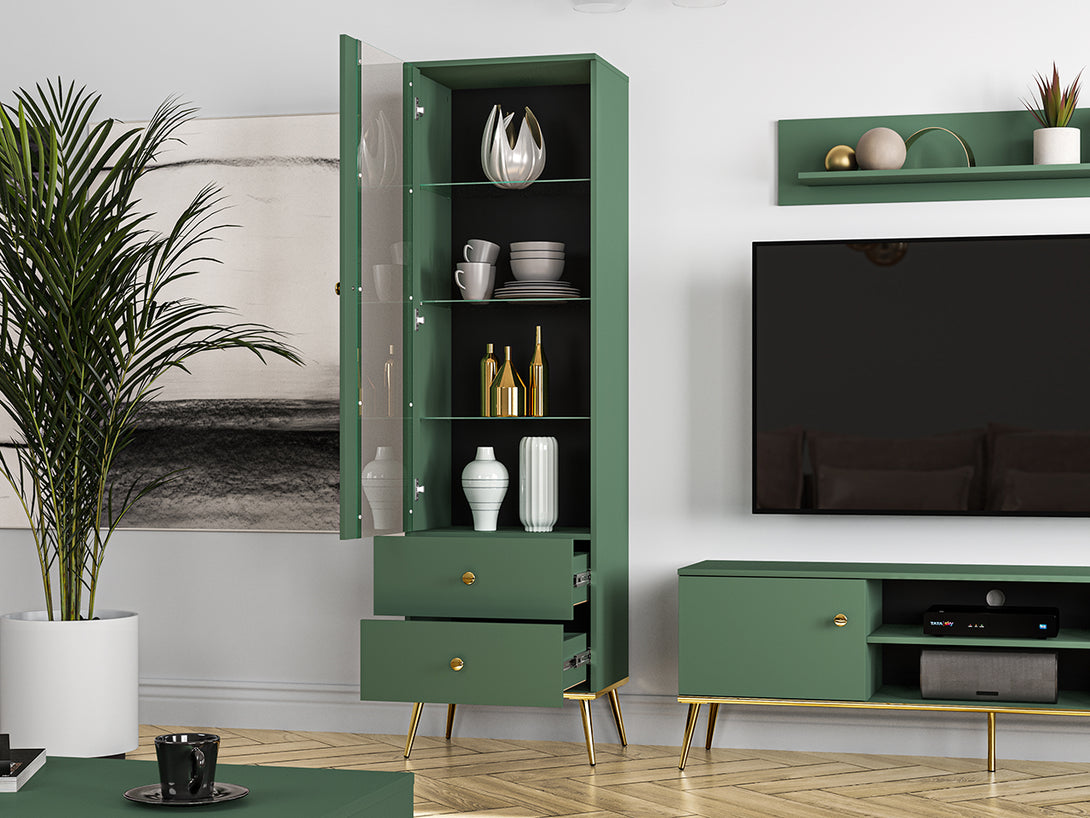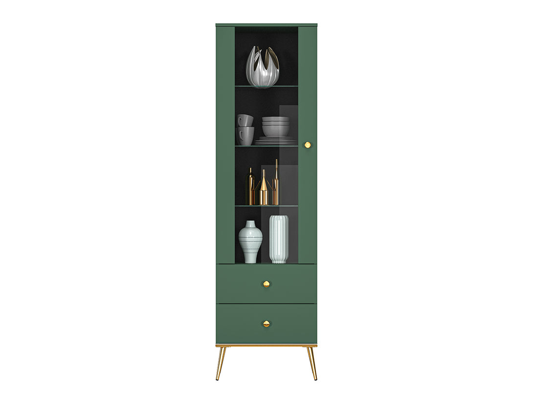 Die FOREST 01 Vitrine verbindet elegantes Design mit praktischer Funktionalität und ist die ideale Wahl für moderne Wohnräume. Mit hochwertigen Materialien wie laminierten Platten, ABS-Kanten und gehärtetem Glas bietet sie Stabilität und Langlebigkeit für den täglichen Gebrauch. Die klare Linienführung und die raffinierte Glasfront setzen Ihre Lieblingsstücke stilvoll in Szene und schaffen eine wohnliche Atmosphäre in jedem Raum.