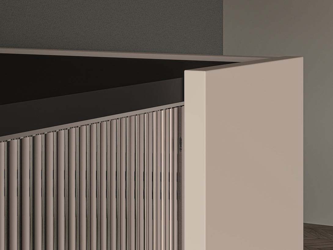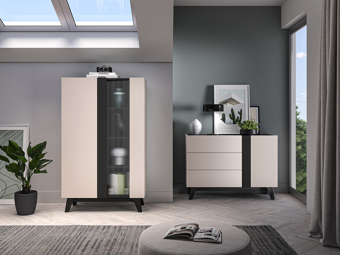 Die FRESHION 02 Vitrine vereint funktionale Aufbewahrung mit stilvoller Präsentation. Acht geräumige Fächer bieten viel Platz für Ihre Lieblingsstücke – von Tischdecken über Dokumente bis hin zu dekorativen Objekten. Die linke Seite wird durch eine schlichte Tür geschlossen, während die rechte Seite mit geriffeltem Strukturglas versehen ist, das das Licht raffiniert bricht und einen stilvollen Einblick auf den Inhalt ermöglicht.