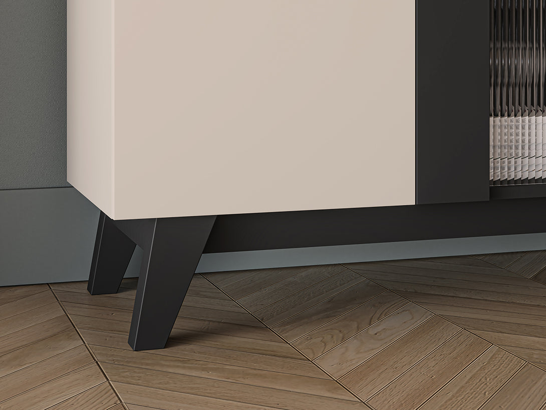 Dank komfortabler Griffmulde und hochwertigem Schließmechanismus mit Soft-Close-Funktion lässt sich die Vitrine leise und bequem öffnen. Die hohen, eleganten Füße verleihen dem Möbelstück eine moderne und luftige Optik, perfekt für stilvolle Wohnräume.