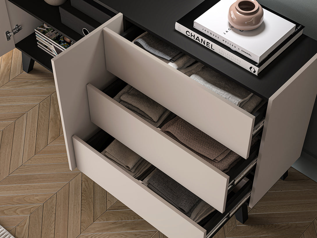 Die kompakte Kommode FRESHION 04 bietet viel Stauraum auf kleinem Raum. Zwei große Fächer hinter den Türen sind perfekt für Kleidung, Geschirr oder Haushaltswaren. Drei breite Schubladen ergänzen das Stauraumkonzept ideal und ermöglichen die ordentliche Aufbewahrung von Tischwäsche oder Wäsche.