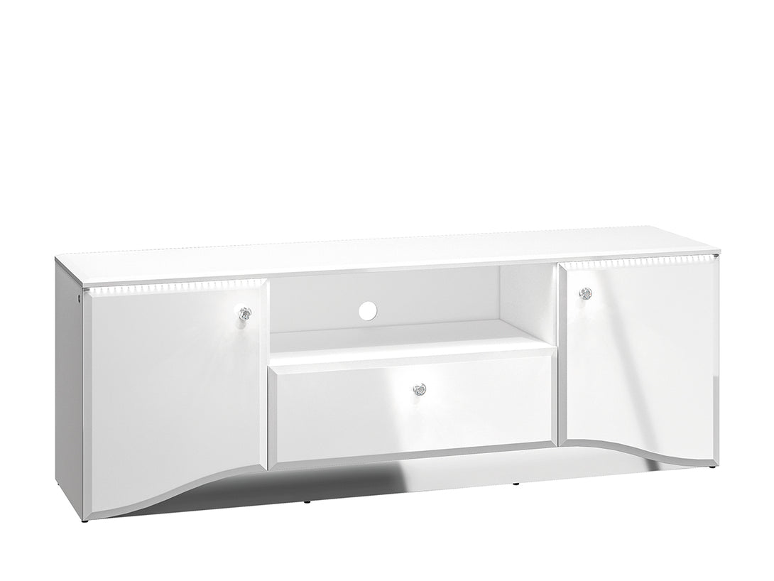 Das stilvolle GLAMOUR Wohnzimmer-Set kombiniert moderne Eleganz mit durchdachter Funktionalität für Ihr Wohnzimmer. Die Vitrine mit Glaseinsätzen, die große Kommode sowie das passende TV-Lowboard sorgen für ein harmonisches Gesamtbild und bieten zugleich großzügigen Stauraum. Dank Hochglanzfronten, leiser Schließmechanismen und integrierter LED-Beleuchtung entsteht ein exklusives Wohnambiente.