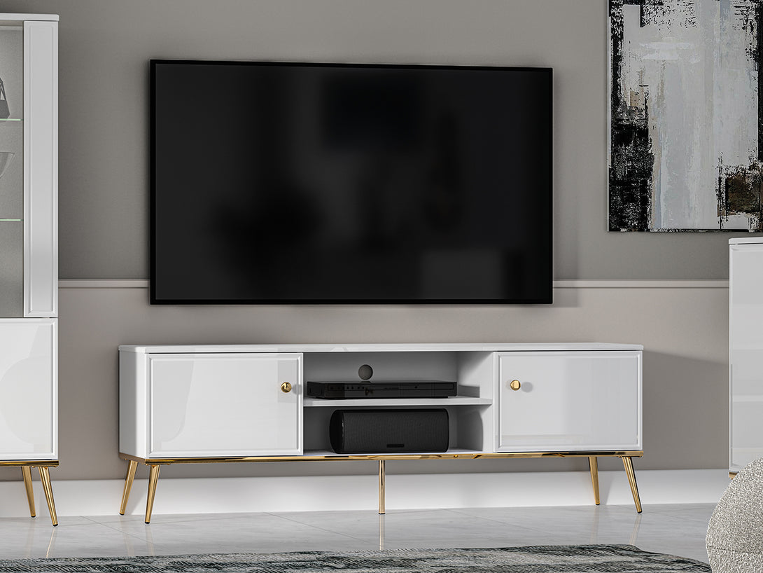 Der GOLDIN 06 TV-Schrank kombiniert modernes Design mit funktionaler Ausstattung und ist die ideale Lösung für stilvolles Home-Entertainment. Die grifflose Front in Weiß Hochglanz sorgt für ein elegantes Erscheinungsbild, während die hochwertige Verarbeitung für Stabilität und Langlebigkeit steht. Dank des Soft-Close-Mechanismus lassen sich Türen sanft und geräuschlos schließen.
