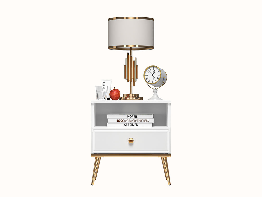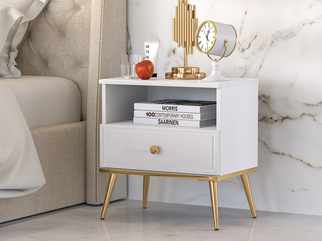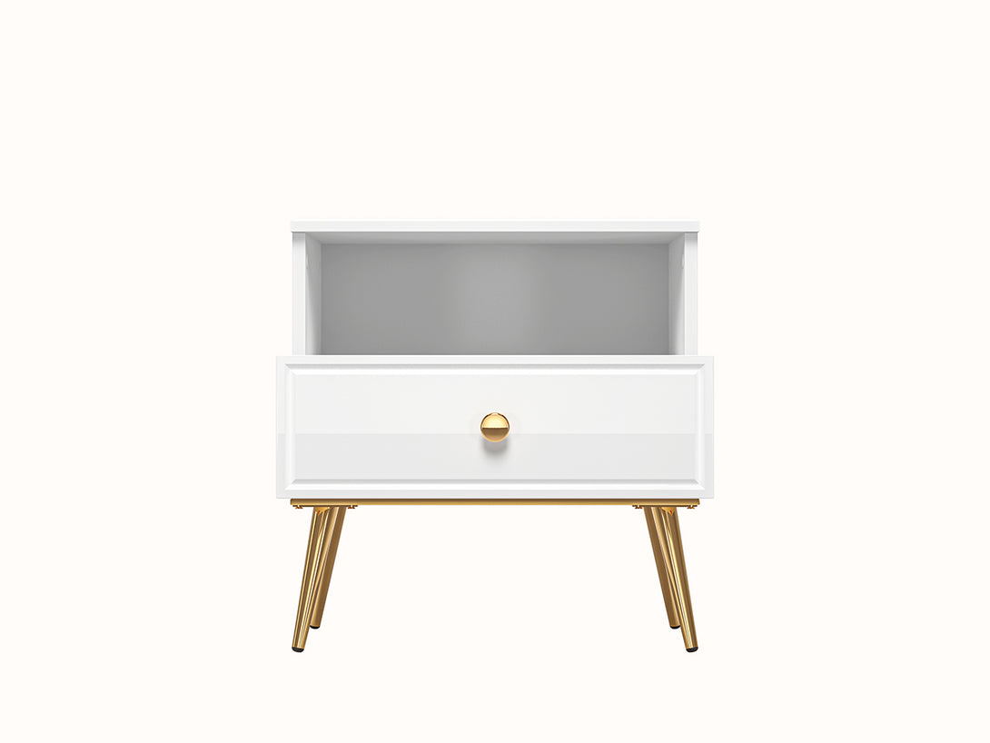 Der stilvolle GOLDIN 07 Nachttisch ist die perfekte Ergänzung für Ihr Schlafzimmer und überzeugt durch ein modernes, minimalistisches Design. Die Hochglanzfront in elegantem Weiß verleiht dem Möbelstück ein frisches, zeitgemäßes Aussehen. Die hochwertige Verarbeitung mit präzisen Kanten und die grifflose Gestaltung sorgen für ein besonders edles Gesamtbild.