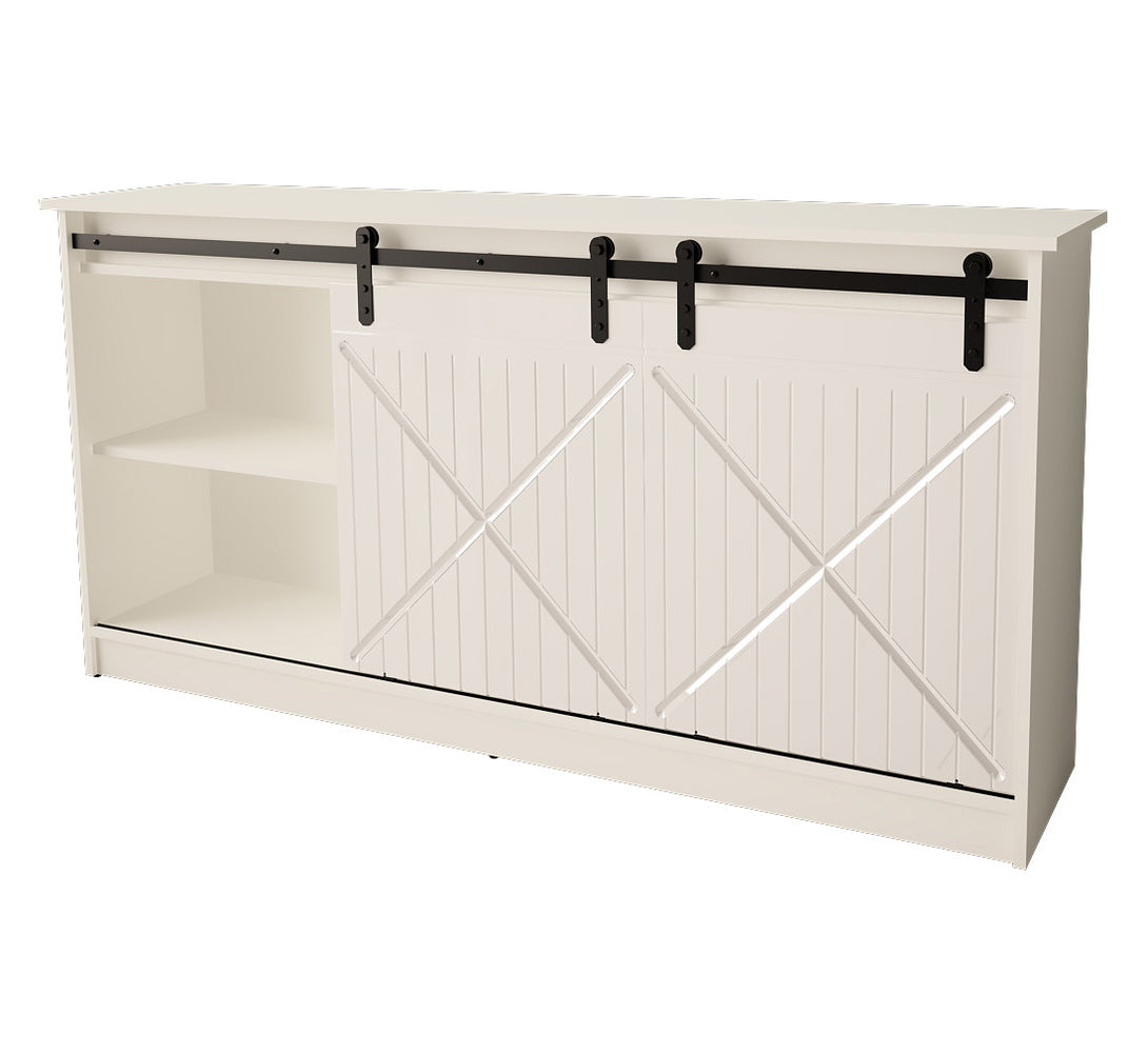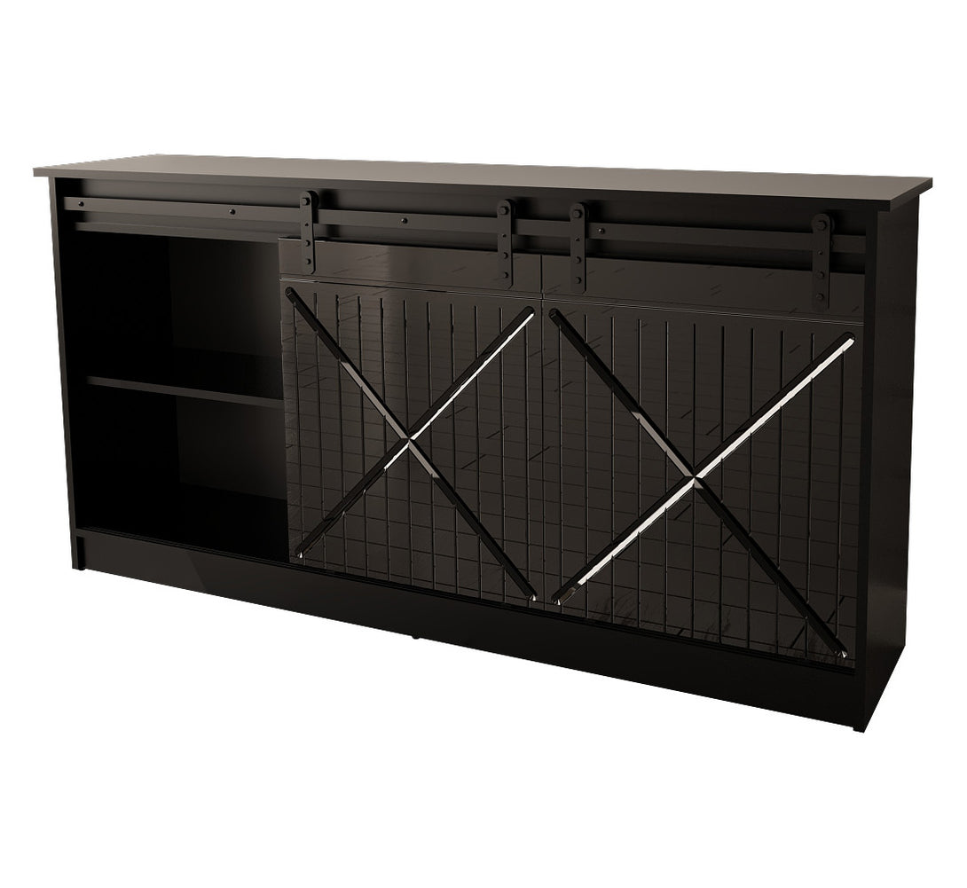 Die hochwertige Verarbeitung zeigt sich in der Kombination aus matt laminiertem Korpus und glänzenden MDF-Fronten. Zwei Türen und eine offene Nische mit Regalböden bieten durchdachten Stauraum für Wohn- oder Schlafzimmer. Ein Designstatement mit Funktionalität.