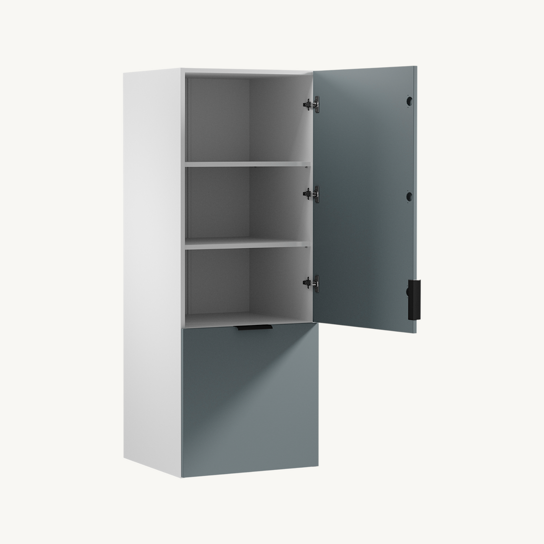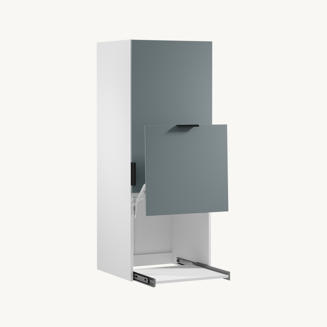 Der Livaro N60N Aufsatz-Hängeschrank kombiniert moderne Funktionalität mit durchdachtem Design. Dank des Free-Up-Hebemechanismus öffnet sich die obere Front mühelos nach oben und bietet bequemen Zugriff auf den Innenraum. Die ausziehbare Ablage auf stabilen Führungsschienen ermöglicht eine flexible Nutzung und schafft zusätzlichen Platz in der Küche. Im oberen Bereich sorgen zwei Einlegeböden für eine übersichtliche Aufbewahrung. Die laminierte 18 mm starke MDF-Platte garantiert Widerstandsfähigkeit gegen Kratzer und Feuchtigkeit, während die matte Oberfläche in Weiß / Grün einen modernen, eleganten Charakter verleiht. Ideal für Küchen, in denen Stauraum und Design gleichermaßen wichtig sind.