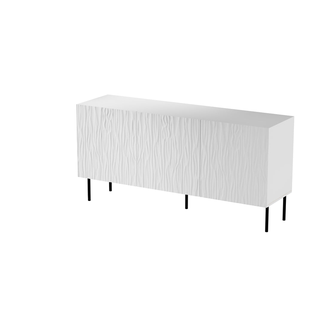 Die hochwertige Kombination aus laminierten MDF-Fronten und einem soliden Korpus auf schwarzen Metallbeinen sorgt für Stabilität und Eleganz. Mit drei Türen, die sich seitlich öffnen lassen, und einem praktischen Innenfach bietet sie ausreichend Stauraum für Wohnzimmer oder Schlafzimmer.
