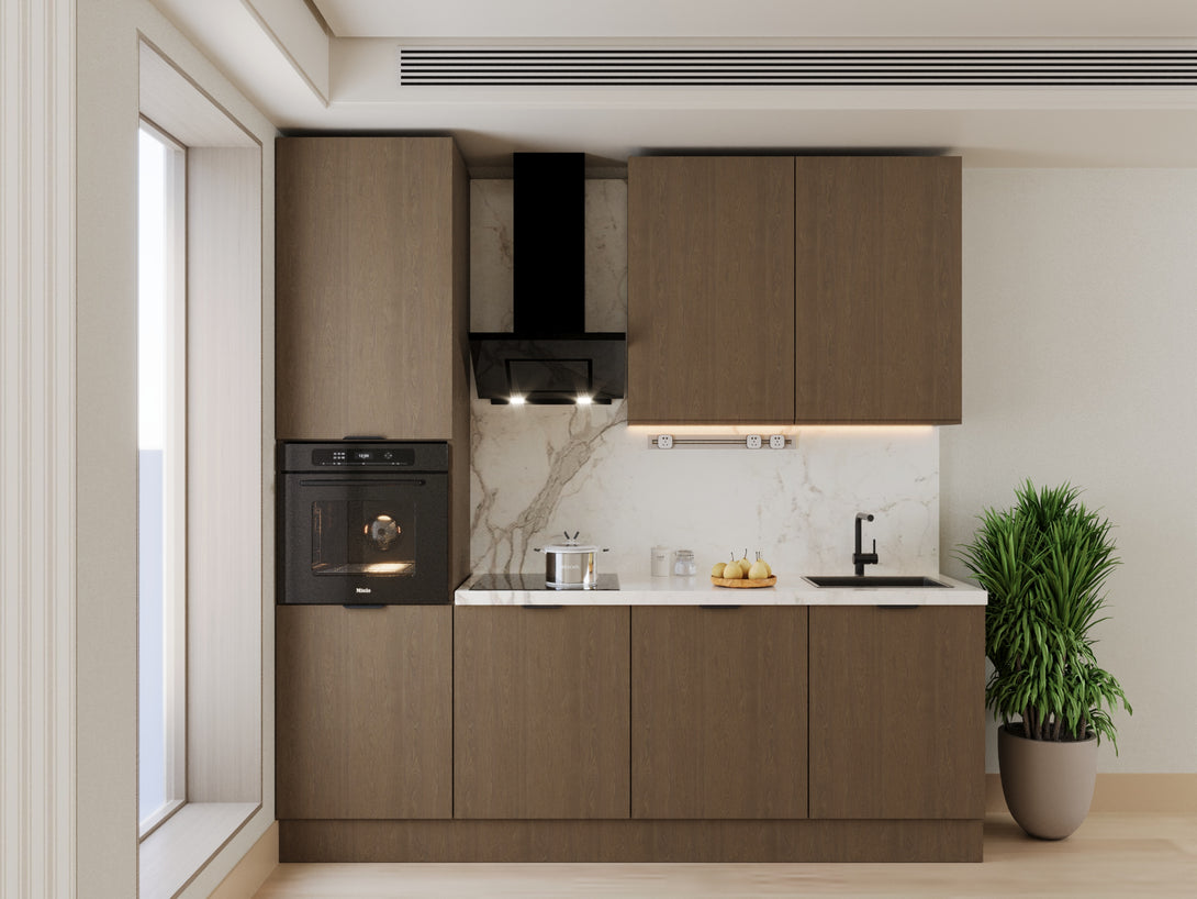 Die Livaro Küchenzeile KU-S29 präsentiert sich in edler Dunkler Eiche und bringt ein Gefühl von Tiefe und Wärme in Ihr Zuhause. Die dunkle Holzoptik verleiht der Küche eine luxuriöse Ausstrahlung, während die Aluminium Griffleiste Schwarz den modernen Charakter unterstreicht. Diese Küchenzeile kombiniert Stilbewusstsein mit Funktionalität – perfekt für designorientierte Wohnräume.