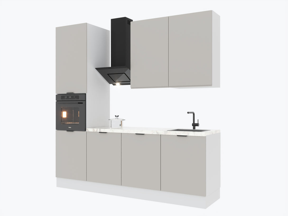 Die Livaro Küchenzeile KU-S31 überzeugt durch ihre harmonische Kombination aus Beige-Fronten und einem weißen Korpus. Das sanfte Farbspiel bringt Helligkeit und Ruhe in den Raum und fügt sich perfekt in moderne Wohnkonzepte ein. Die Aluminium Griffleiste Schwarz setzt dabei einen eleganten Akzent. Eine ideale Lösung für alle, die zeitloses Design und Funktionalität in einem kompakten Küchenkonzept suchen.