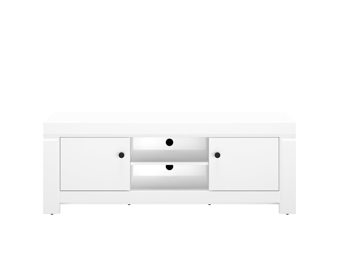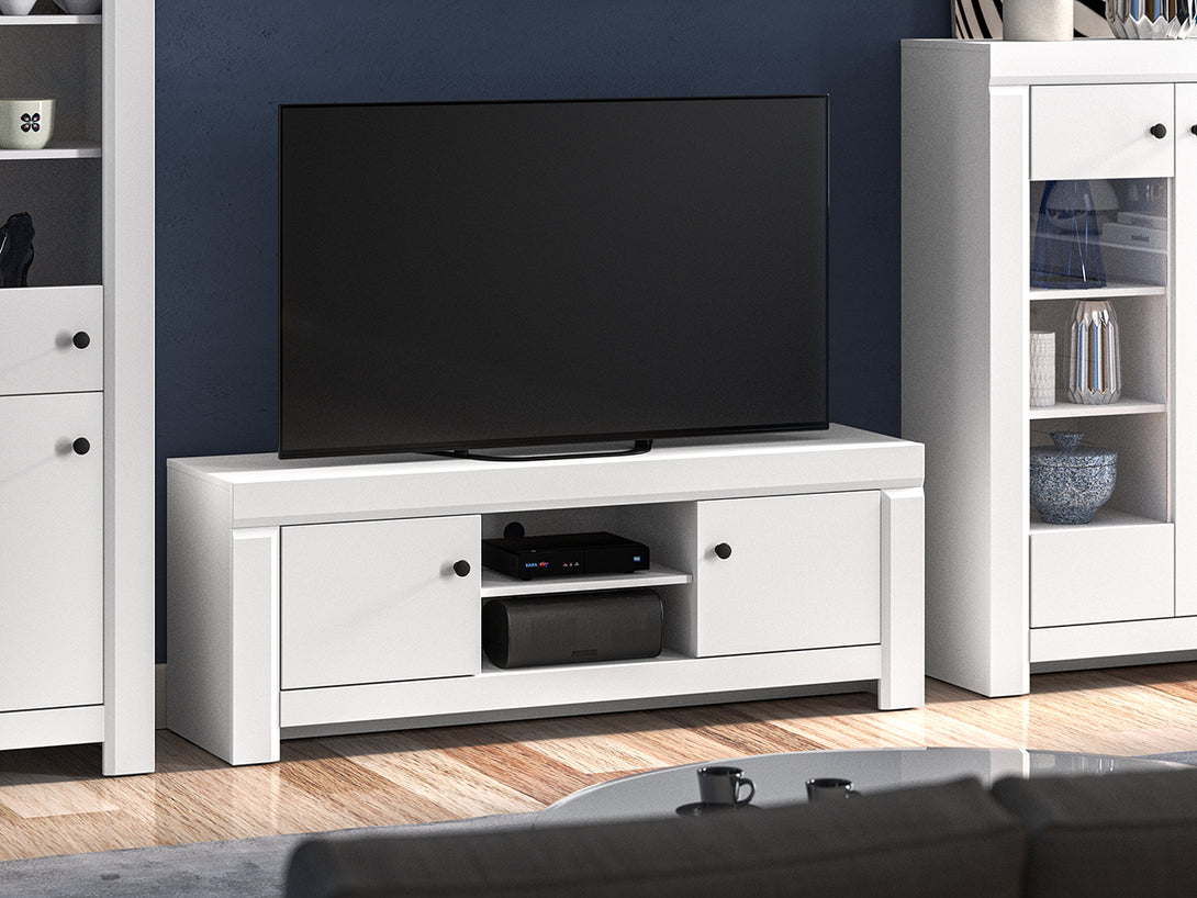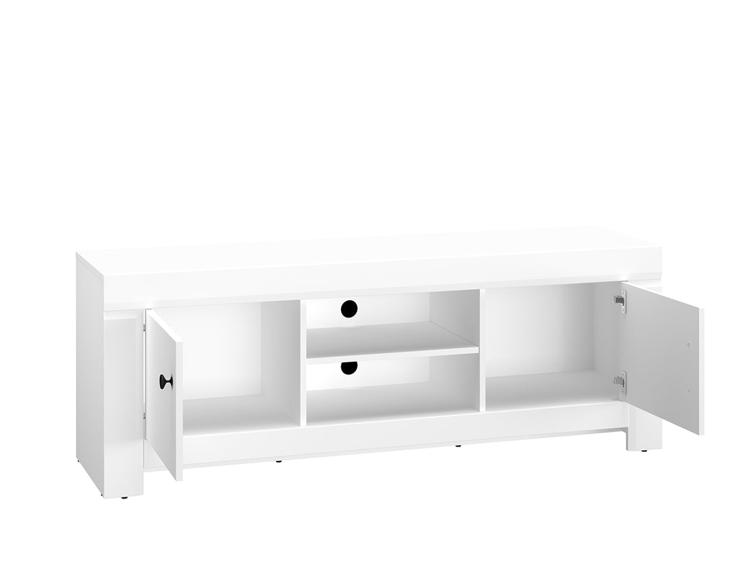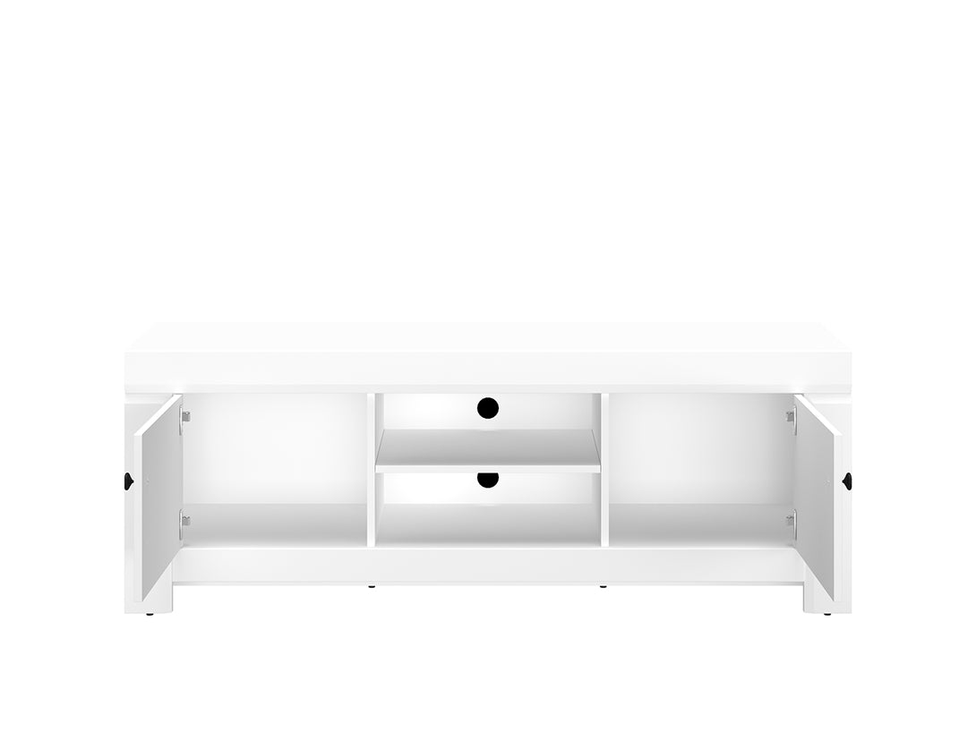 Der LAHTI 11 Szafka RTV besticht durch sein minimalistisches Design und seine praktische Funktionalität. Die weiße matte MDF-Front harmoniert perfekt mit dem weißen Korpus und verleiht dem TV-Schrank eine zeitlose Eleganz, die sich ideal in moderne Wohnräume integriert. Mit hochwertiger Laminatplatte und ABS-Kanten bietet dieses Möbelstück langlebige Qualität und pflegeleichte Oberflächen.