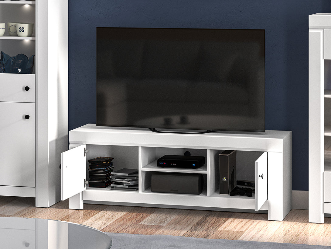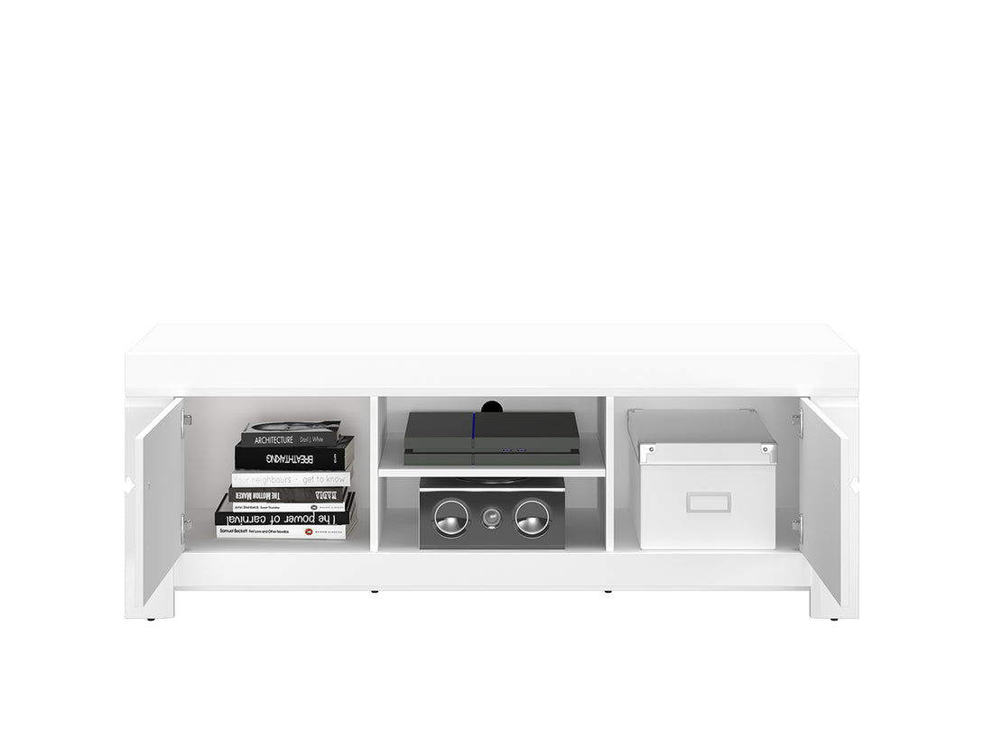 Ausgestattet mit Soft-Close-Technik sorgt der Schrank für ein geräuschloses Schließen der Türen. Das geradlinige Design kombiniert Ästhetik mit viel Stauraum für Ihre Unterhaltungselektronik und Zubehör.