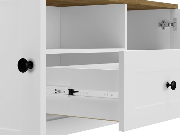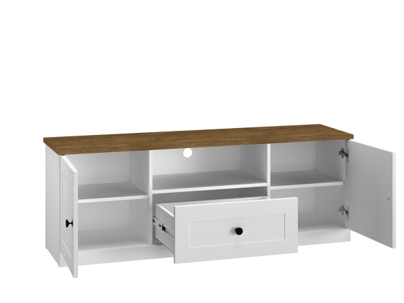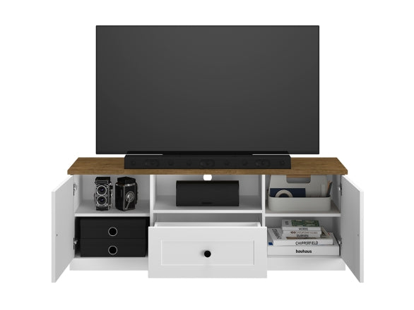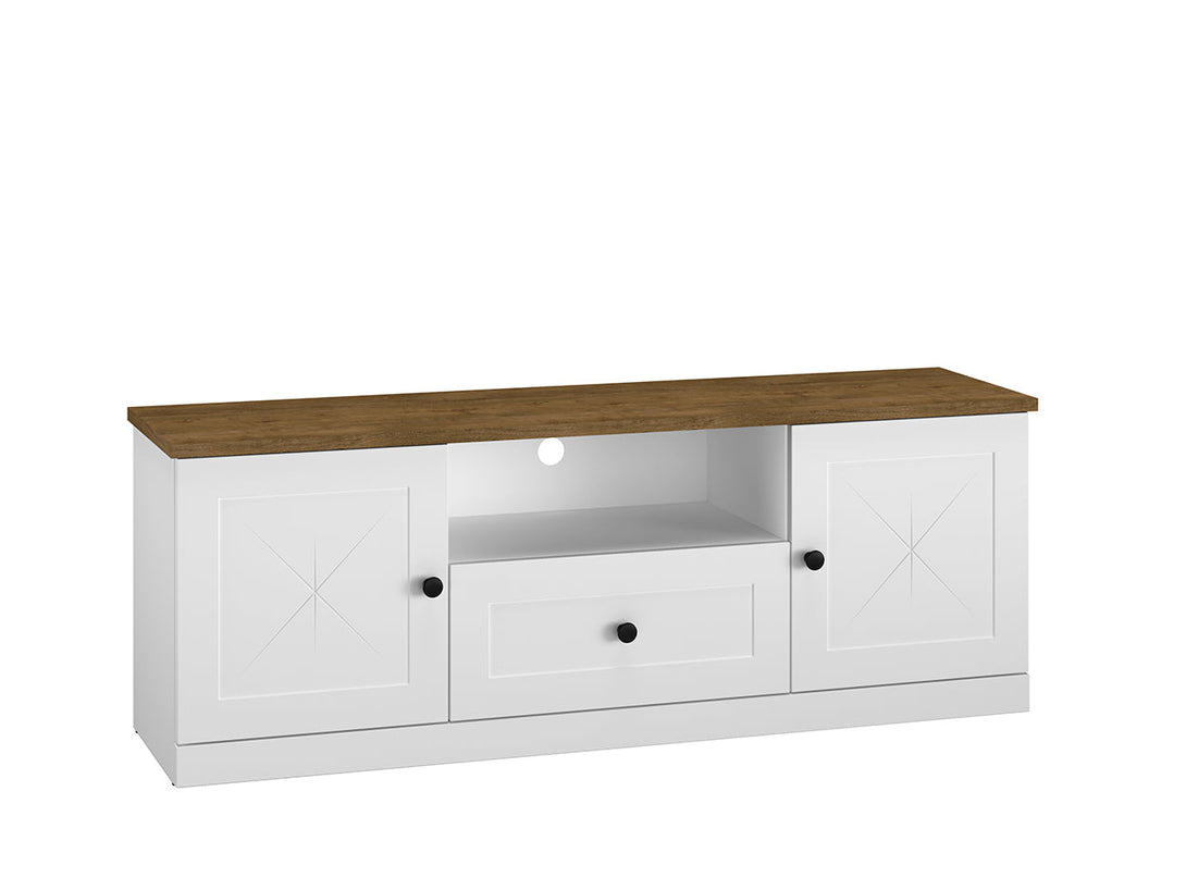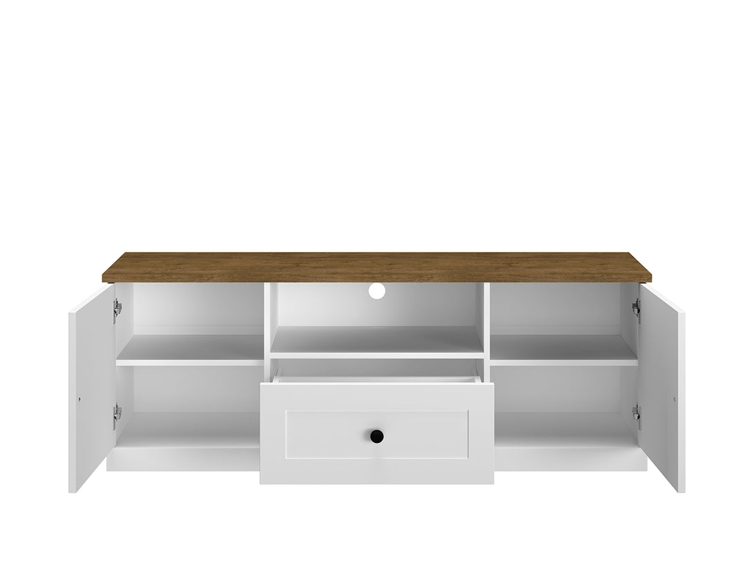 Der LILLE 09 TV-Schrank kombiniert zeitgemäßes Design mit funktionalem Stauraum und ist die perfekte Ergänzung für moderne Wohnzimmer. Die Front in mattem Weiß MDF und der Korpus in einer eleganten Holzoptik verleihen dem Möbelstück eine stilvolle und warme Ausstrahlung.