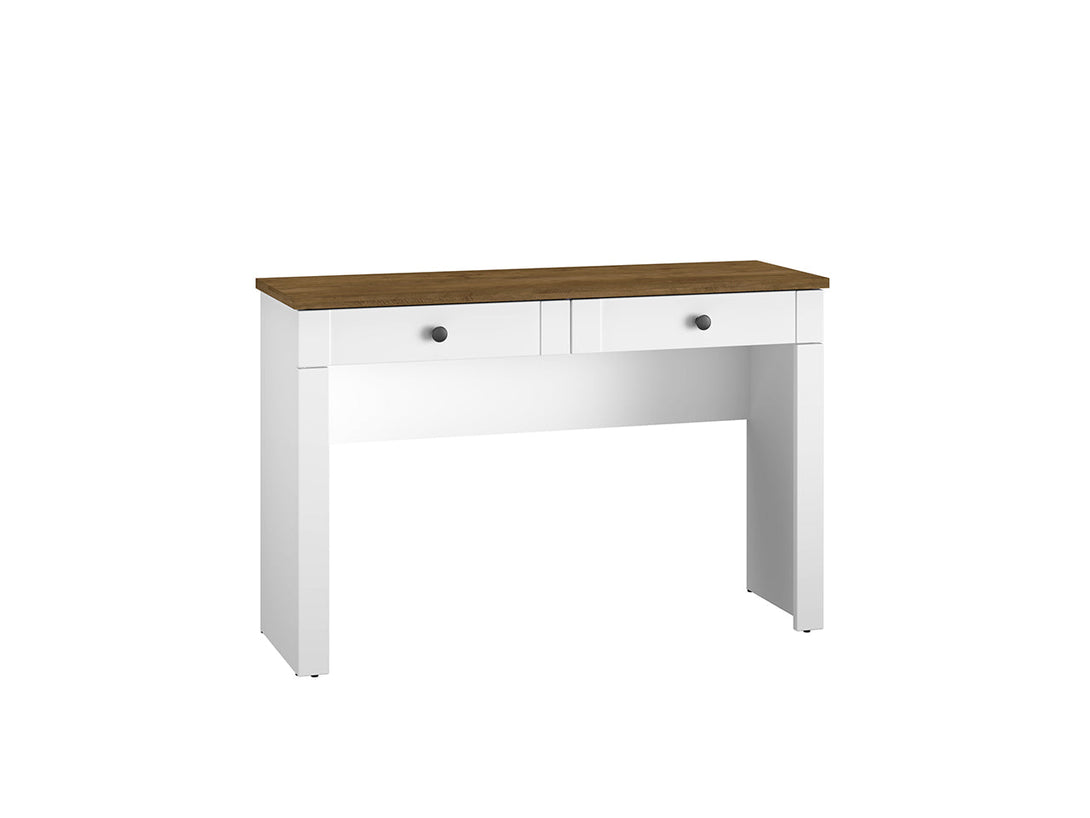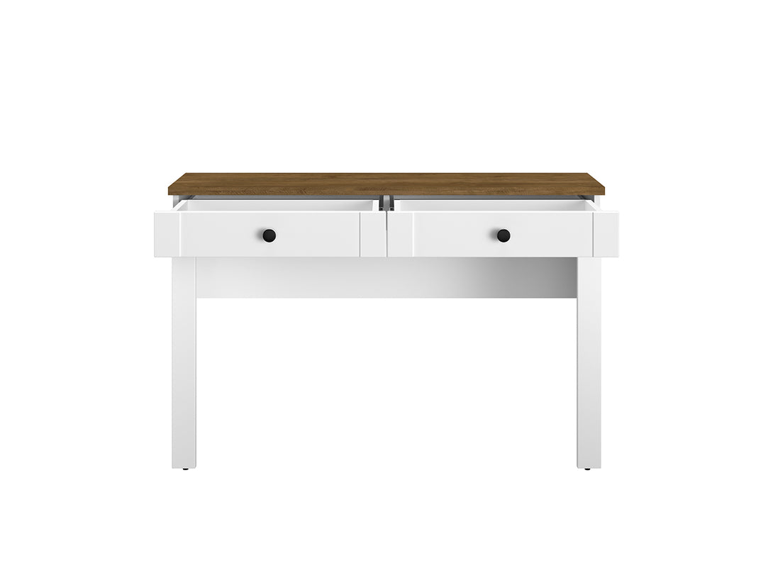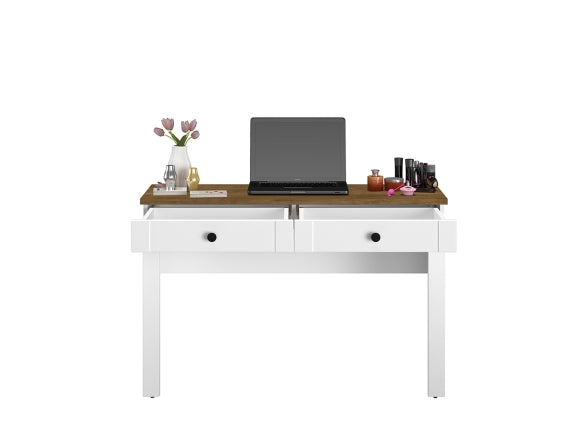 Der LILLE 16 Schreibtisch ist eine stilvolle und praktische Lösung für Ihr Arbeitszimmer oder Büro. Mit seinem modernen Design und der eleganten Holzoptik fügt er sich harmonisch in jede Einrichtung ein und bietet zugleich eine stabile und funktionale Arbeitsfläche. Die hochwertige Verarbeitung mit ABS-Kanten und die voll ausziehbare Schublade gewährleisten Langlebigkeit und Benutzerfreundlichkeit. Die Kombination aus MDF in Weiß Matt und dem natürlichen Farbton Dąb Lefkas verleiht dem Schreibtisch eine zeitlose Eleganz.