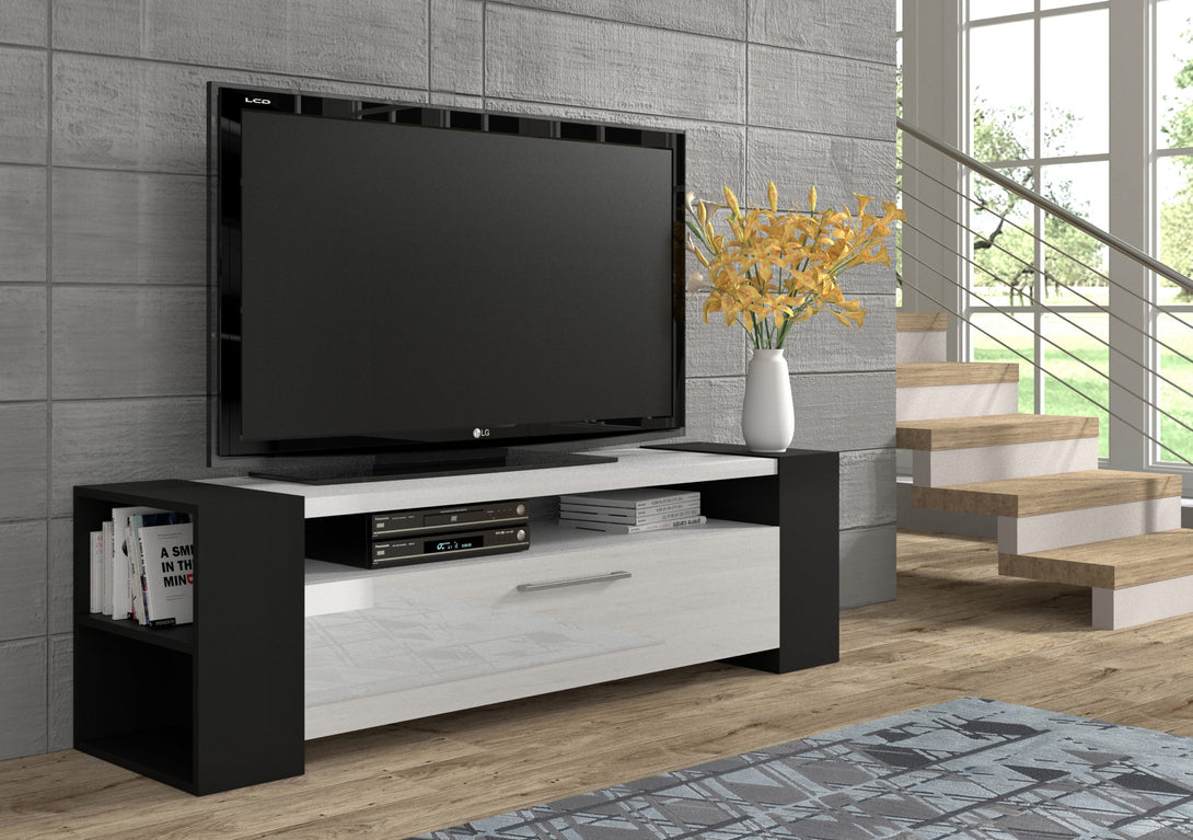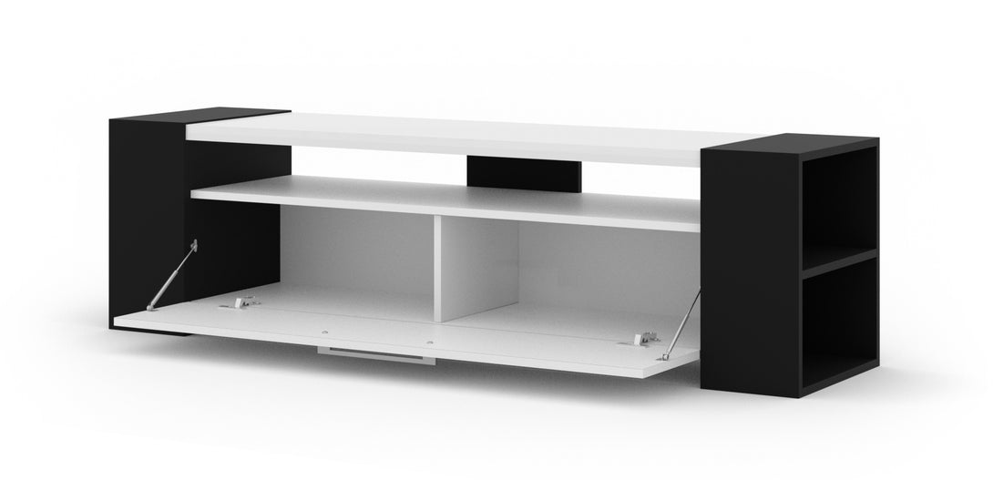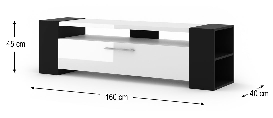 Das LIVIA TV-Lowboard vereint elegantes Design mit praktischer Funktionalität und bietet die perfekte Lösung für stilvolle Wohnzimmer. Mit einem durchdachten Aufbau aus offenen und geschlossenen Fächern eignet es sich hervorragend zur Aufbewahrung von Mediengeräten, Zubehör und dekorativen Elementen. Der mittige offene Bereich eignet sich ideal für Set-Top-Boxen oder Konsolen, während die seitlichen Ablagen zusätzlichen Stauraum schaffen. Die geschlossene Kammer mit einer internen Trennwand sorgt für aufgeräumte Verhältnisse. Hochglanzfronten und eine stabile Konstruktion runden das Möbelstück optisch und funktional ab.