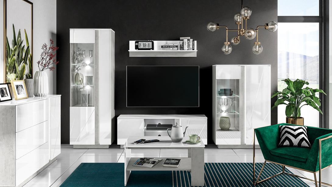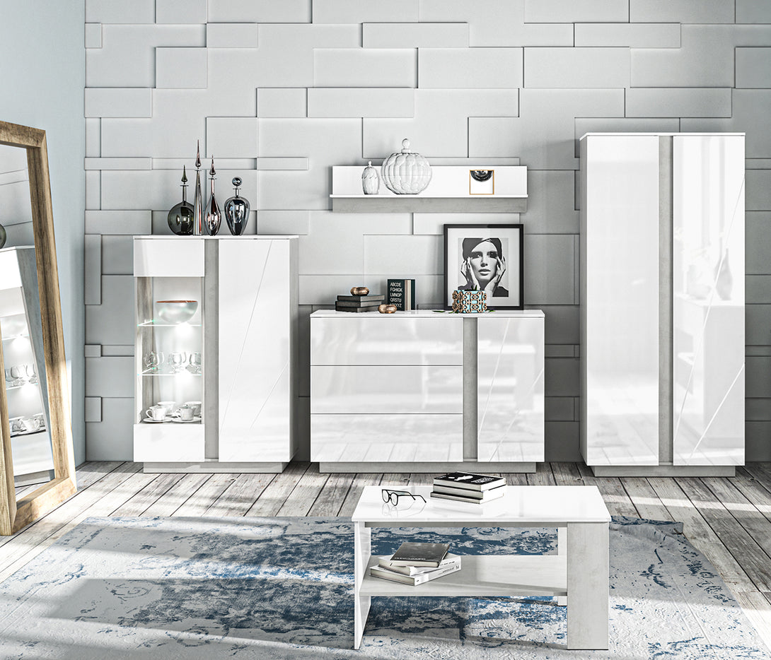 Der LUMENS 10 Couchtisch verbindet minimalistisches Design mit funktionaler Eleganz und ist die perfekte Ergänzung für moderne Wohnräume. Die hochwertige Verarbeitung aus MDF und laminierter Spanplatte mit ABS-Kanten sorgt für Langlebigkeit und Stabilität, während die Hochglanzfront in Weiß mit Betonoptik ein stilvolles Statement setzt.
